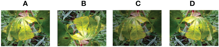 Cassava Brown Streak Disease. (A) original (B) Rotation by 180° (C) Brightness reduction (D) Horizontal flipping.