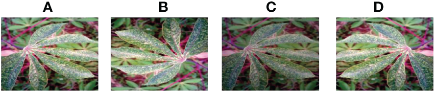 Cassava Green Mottle. (A) original (B) Rotation by 180° (C) Brightness reduction (D)Horizontal flipping.