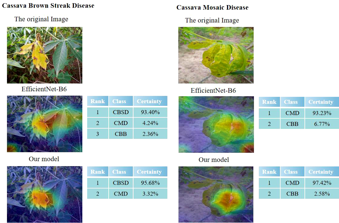 With the current climate posing a threat to human health, vegetation and biodiversity (Bhatti et al., 2022a), and the outbreak of the novel coronavirus pneumonia, major cities across the country have suspended production in order to effectively prevent the spread of the epidemic (Bhatti et al., 2022b). The importance of food is self-evident. In recent years, the planting area has continued to expand, and it is also a key food security crop for smallholder farmers because it can withstand harsh conditions. However, with the increase in cassava planting areas, the disease problem is becoming increasingly prominent. Cassava disease can generally be diagnosed according to the shape, color, and leaf shape characteristics of the disease spots on cassava leaves. Under the influence of environmental factors, cassava disease is more likely to occur, which affects the yield and quality of cassava. According to the different characteristics, cassava disease can be mainly classified into Cassava Bacterial Blight (CBB), Cassava Brown Streak Disease (CBSD), Cassava Green Mottle (CGM), Cassava Mosaic Disease (CMD), etc., which can lead to reduced and/or diseased cassava output. Due to the small number of professional plant personnel of cassava and the lack of professional knowledge of general plant personnel of cassava, the symptoms of cassava leaf disease are not typically studied with good understanding, which can lead to inaccurate and incorrect diagnoses of cassava disease. At the same time, the artificial diagnosis and treatment of cassava leaf diseases not only wastes a lot of manpower and material resources but also results in omission and error from subjective judgment due to the relatively similar characteristics of each leaf disease. The diversity of solutions for cassava disease often prevents effective treatment of cassava, so it is very important to correctly identify the disease. Therefore, as an auxiliary means, computer technology can be applied to help planting personnel determine whether there is cassava disease and of which type, and then the best treatment can be given, to avoid yield decline.
