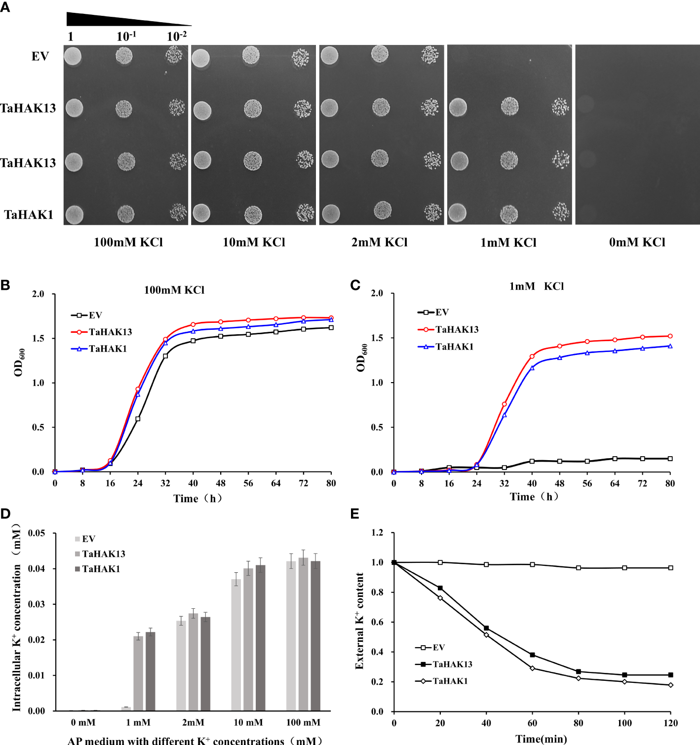 Figure 5 TaHAK13 complementarity analysis in a Trk1 and Trk2 K+ uptake system deficient yeast strain (A) Growth of mutant CY162 in AP-U solid media with different concentrations of K+. CY162 was transformed with the empty vector p416 (EV), TaHAK13-p416 (TaHAK13), or TaHAK1-p416 (TaHAK1). After serial dilution, each strain was added to an agar plate for culture. (B) Growth curves for CY162 transformed with the empty vector, TaHAK13, or TaHAK1 in AP-U liquid medium supplemented with 1mM K+ or 100 mM K+. (C) Determination of the K+ content in CY162 transformed with the empty vector p416, TaHAK13, or TaHAK1 in solid AP-U media with various concentrations of K+. (D) K+ depletion experiment in the presence of 1 mM K+ in AP-U medium. CY162 (transformed with p416, TaHAK13, or TaHAK1) was subjected to K+ starvation for 4 h before beginning the experiment. The K+ content in the buffer was measured at intervals of 2 h.