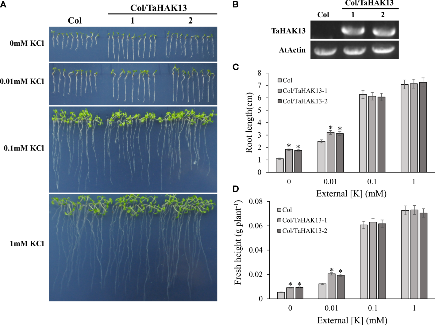 Figure 7 Functional verification of TaHAK13 in wild-type Arabidopsis thaliana. (A) Wild-type (Col) and transgenic lines (Col/TaHAK13) were grown on MS media with different K+ concentrations for 10 d. (B) The expression of TaHAK13 in Col and transgenic Arabidopsis thaliana was quantified via RT-PCR. (C) The root length of the plant in each bar represents the average root length of 20 seedlings from three independent experiments. (D) The fresh weight of plants in each bar represents the average fresh weight of 20 seedlings from three independent experiments. The Student t-test (*p<0.05) was used to analyze the statistical significance.