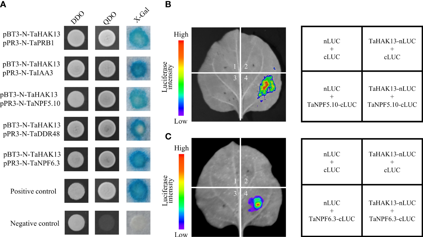 Figure 9 The interaction of TaHAK13 with TaNPF5.10 and TaNPF6.3. (A) The interaction of TaHAK13 with screened proteins was verified using a split-ubiquitin yeast two-hybrid system; different protein combinations were detected on appropriate screening media (SD/-L-T, SD/-A-/H/-L/-T, SD/-A/-H/-L/-T+20μg/mL X-Gal). (B) LCA of the interaction between TaHAK13 and TaNPF5.10. (C) LCA of TaHAK13 and TaNPF6.3. As shown in the graphics, various combinations were used to co-transform tobacco leaves. Luciferase signals were captured by a NightSHADE LB 985 plant in vivo imaging system.