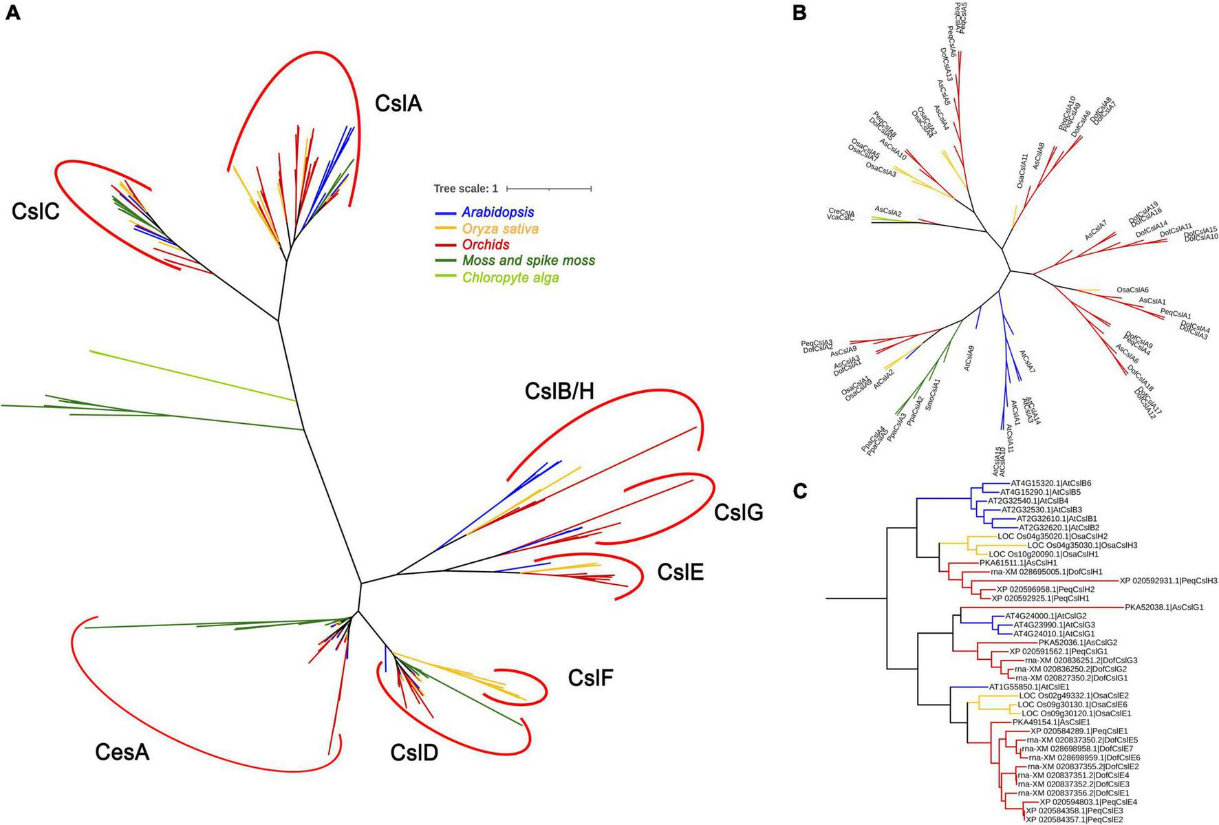 Figure 2. Phylogenetic relationships between Cellulose synthase proteins from nine representative species: two chlorophyte algae (light green), a moss and spike moss (dark green), three orchid species (red), rice (yellow), and Arabidopsis (blue). The CesA/Csl proteins were grouped into nine families: CesA, CslA, CslB, CslC, CslD, CslE, CslF, CslG, and CslH. (A) The phylogenetic tree contains all 273 CesA/Csl protein sequences; (B) phylogenetic tree showing only the CslA cluster; (C) phylogenetic tree showing only the CslB/H/E/G cluster. The sequences in (B,C) were extracted from (A) and realigned.