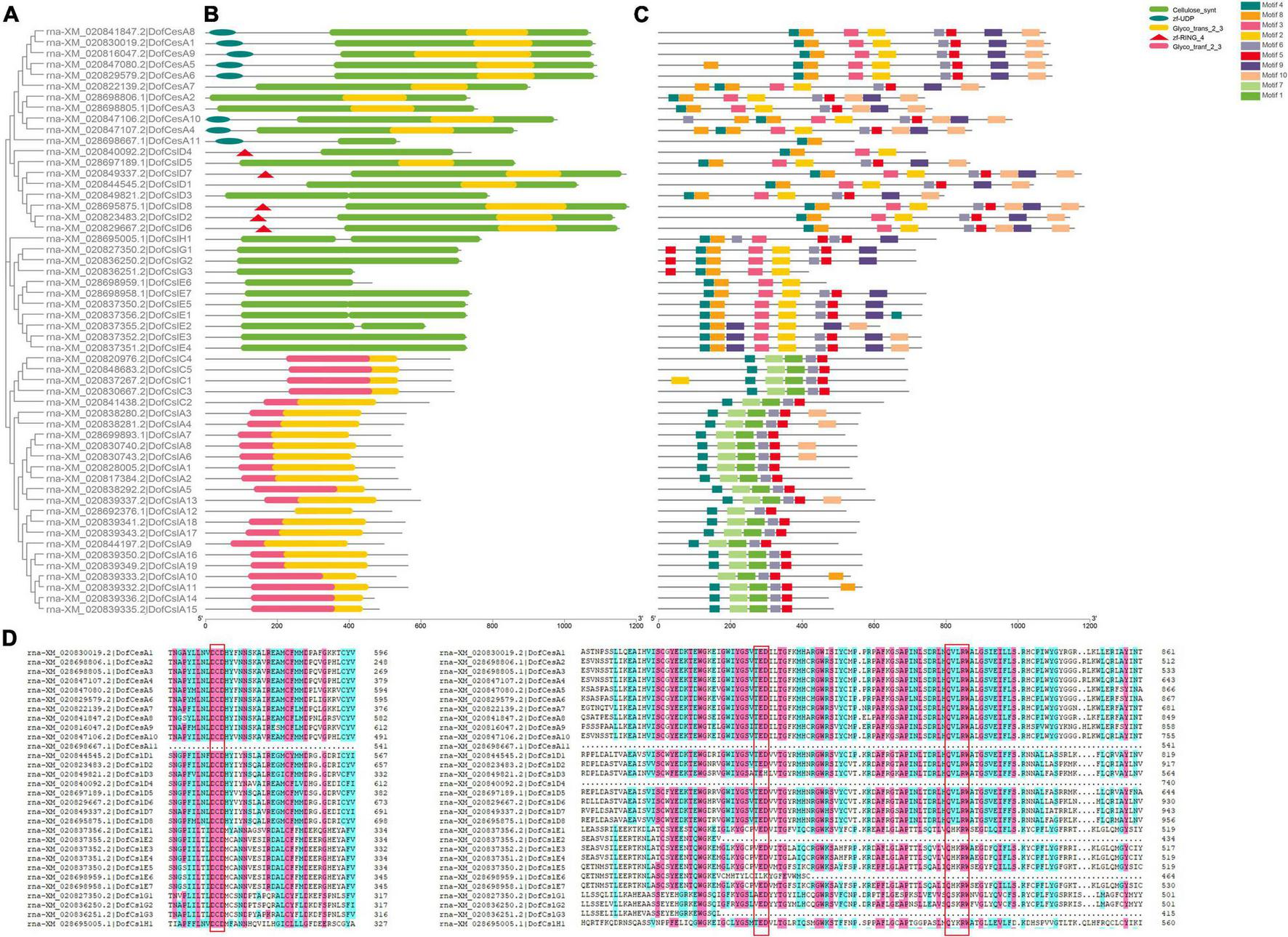 Figure 3. Phylogenetic, conserved domain and motif analyses of Cellulose synthase proteins in D. officinale (Dof). (A) Phylogenetic tree of the DofCesA/DofCsl proteins; (B) Schematic presentation of the domains of the DofCesA/DofCsl proteins; (C) Schematic presentation of the conserved motifs in the DofCesA/DofCsl proteins; (D) Comparison of the deduced amino acid sequences of Cellulose synthase in D. officinale. The conserved cysteine residues are marked by red frames. The full versions of multiple alignments of the DofCesA/DofCsl protein sequences are shown in Supplementary Figure S5. The scale bar (aa) indicates the amino acid position within the corresponding conserved domain/motif.