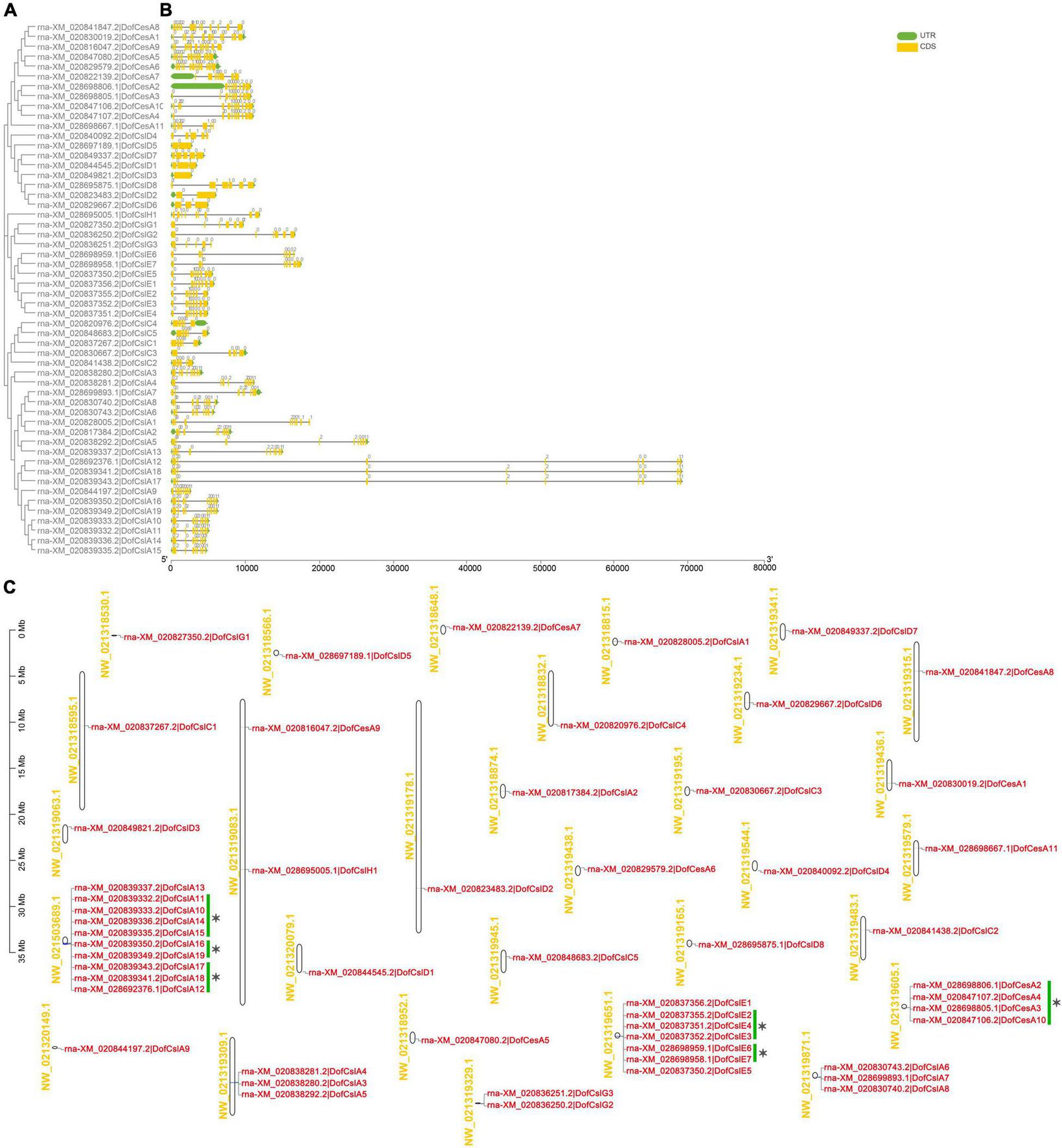 Figure 4. Phylogenetic, gene structure, and distribution analyses of Cellulose synthase superfamily genes in D. officinale (Dof). (A) Phylogenetic relationships of the DofCesA/DofCsl genes; (B) Sequence analysis of exon–intron structures of the Cellulose synthase genes. UTRs and exons are indicated using green and yellow rectangles, respectively. The solid lines indicate introns. The numbers above the solid lines represent the intron phase. The scale bar (bp) indicates the length of the corresponding genes; (C) distribution of theCellulose synthasegenes in the D. officinale genome. The scaffold names are shown on the left, and the gene names are on the right. The scale bar (Mb) indicates the length of the corresponding scaffolds. A total of 14 tandemly duplicated genes (with two or more homologous genes ≤ 100 kb apart) were found. Green scale bars and asterisks indicated alternative splicing genes.