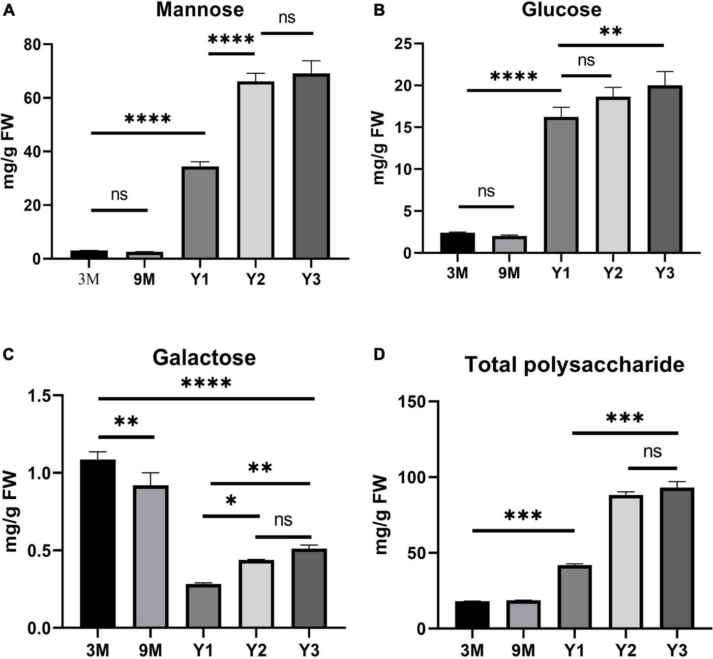 Figure 6. Histogram of the contents of water-soluble polysaccharides and monosaccharide components (mg/g) in the stems of D. officinale in different growth stages, including 3M, 9M, Y1, Y2, and Y3. (A) Mannose content; (B) glucose content; (C) galactose content; (D) total polysaccharide content. *p value < 0.05, **p value < 0.01, ***p value < 0.001, ****p value < 0.0001.