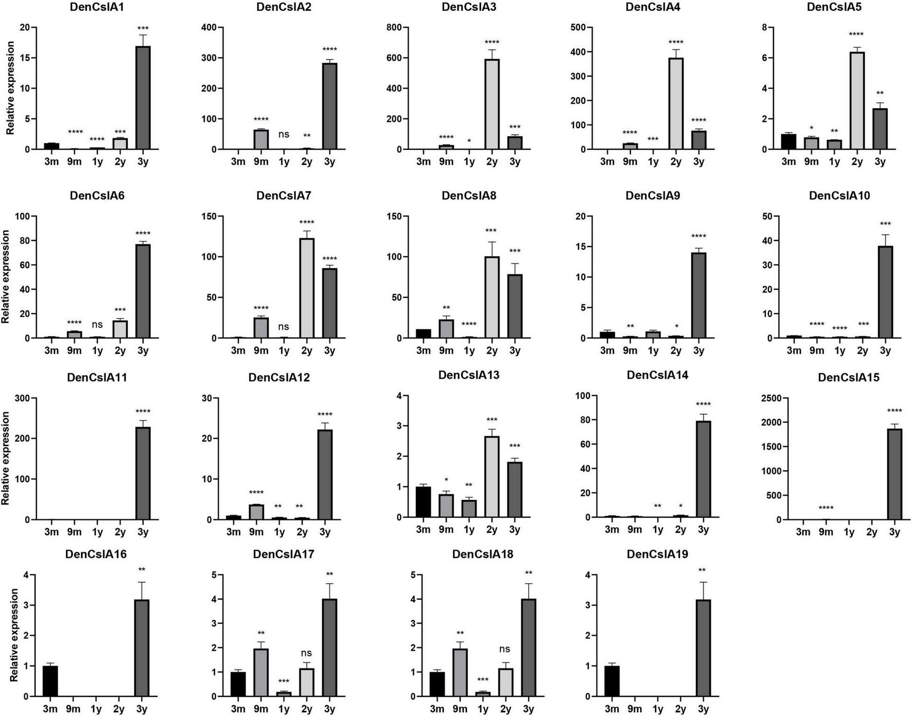 Figure 7. Expression levels of DofCslA genes in the stems of D. officinale in different growth stages (including 3M, 9M, Y1, Y2, and Y3), as determined by qRT–PCR analysis. The results are shown as the means ± SDs of three independent experiments. The presented expression levels are relative to the expression of the reference gene. *p value < 0.05, **p value < 0.01, ***p value < 0.001, ****p value < 0.0001.