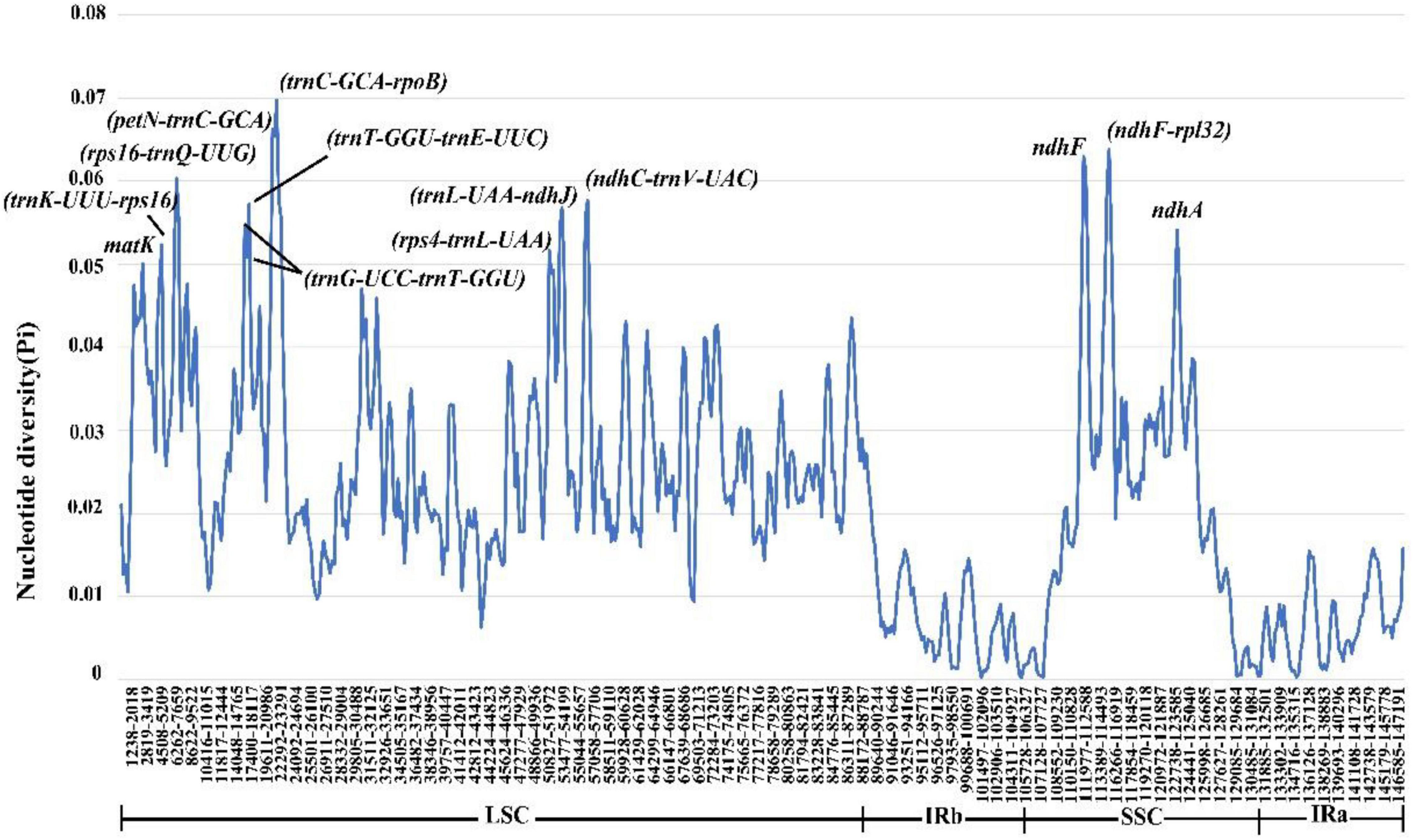 To comprehensively understand the sequence divergence of the chloroplast genomes of Coleanthus subtilis and its related species, we calculated Pi values for nucleotide diversity. Pi values fluctuated between 0 and 0.0697, with a mean value of 0.02172 (Figure 9). We identified 13 polymorphic regions (matK, trnK-UUU/rps16, rps16/trnQ-UUG, trnG-UCC/trnT-GGU, trnT-GGU/trnE-UUC, petN/trnC-GCA, trnC-GCA/rpoB, rps4/trnL-UAA, trnL-UAA/ndhJ, ndhC/trnV-UAC, ndhF, ndhF/rpl32, and ndhA) with nucleotide diversity >0.05, 10 of which were intergenic spacer regions and the remaining three were protein-coding regions. Meanwhile, no highly variable loci were detected in the IR regions and the nucleotide diversity values were significantly lower than those in the single copy regions (Figure 9 and Supplementary Table 13).