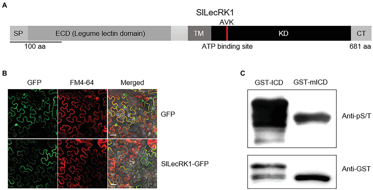 Characterization of SlLecRK1. (A) Diagram of the functional domains in SlLecRK1. SP, signal peptide; ECD, extracellular domain; TM, transmembrane domain; KD, kinase domain; CT, C-terminal region. The red bar in the KD marks the AVK motif (the ATP-binding site). (B) Confocal microscopic images of SlLecRK1Pro:SlLecRK1-GFP transiently expressed in N. benthamiana leaves. FM4-64 was used as a marker for the plasma membrane. Bars, 20 μm. (C) Immunoblot analysis of GST-ICD and GST-mICD recombinant proteins using antibodies specific for serine and threonine phosphorylation (pS/T). Anti-GST antibodies were used as a loading reference.