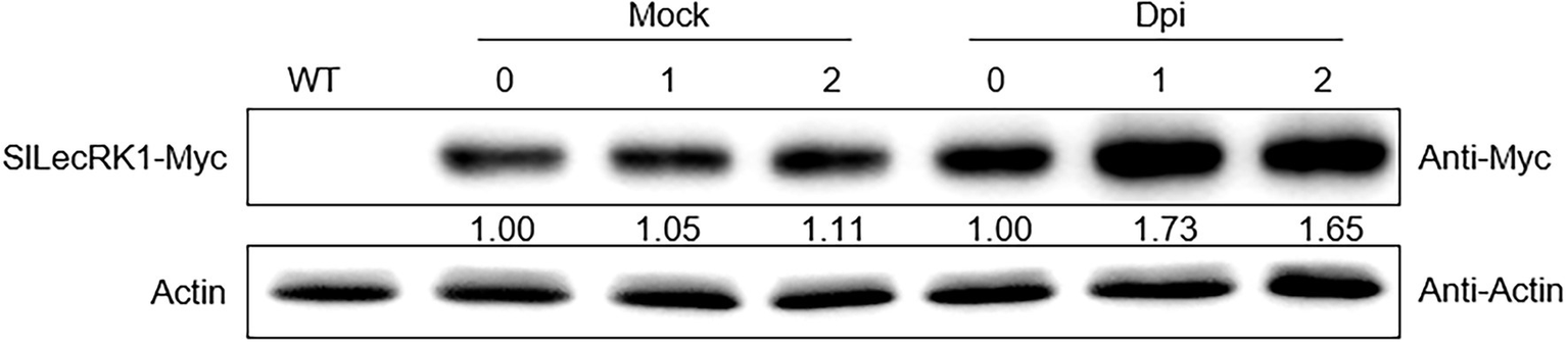 We next compared fungal accumulation at the stem in OE and WT plants at 2 weeks after FORL infestation. Cotton blue staining revealed fewer fungi in the stems of OE-1 and OE-2 plants compared to wild type (Figure 3E). Consistently, the concentrations of FORL DNA in OE-1 and OE-2 were about half of that in WT plants (Figure 3F). We also observed SlLecRK1 accumulation following inoculation with FORL (Figure 4), indicating the inhibitory effects of increased SlLecRK1 expression on fungal growth.