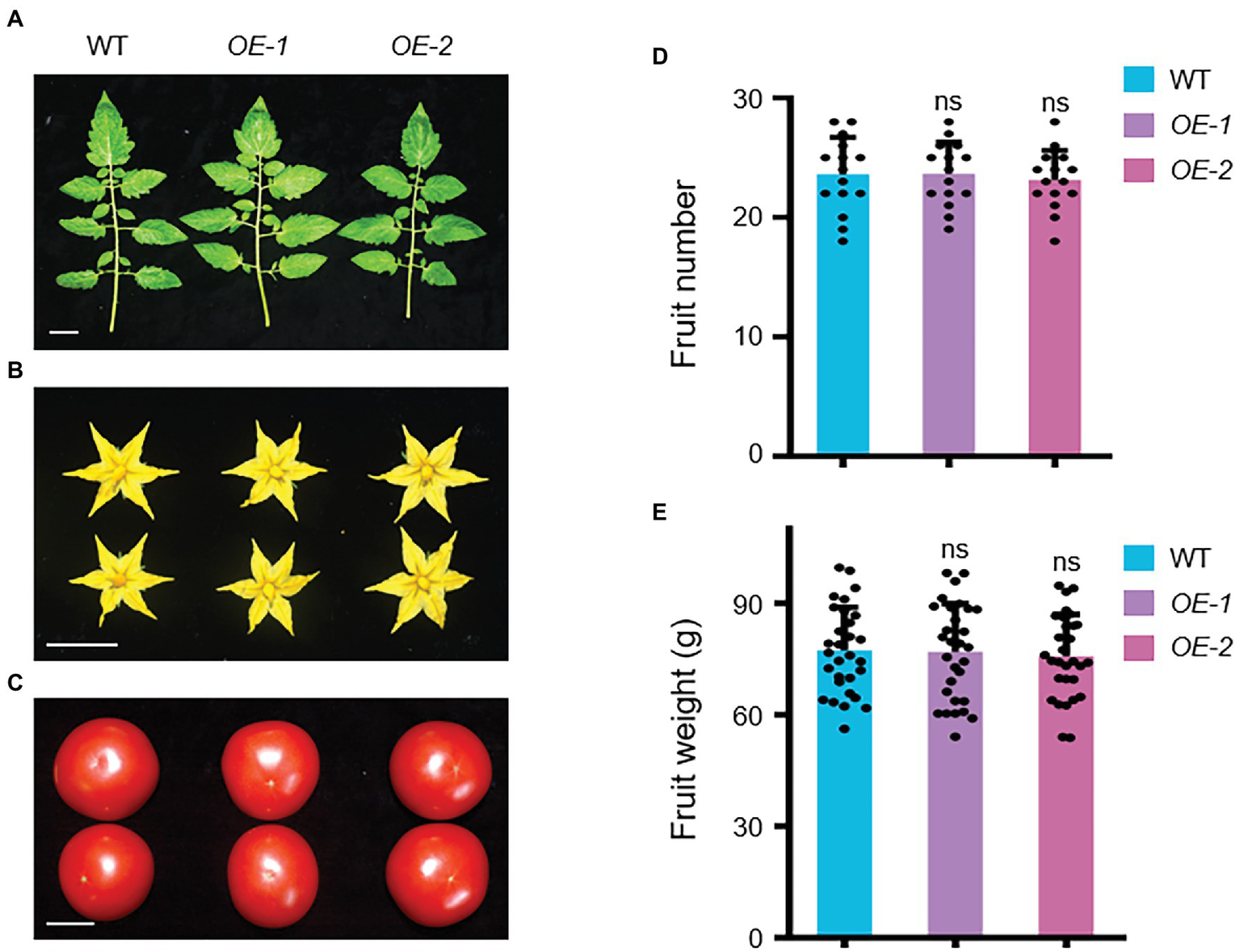 Agronomic Traits of SlLecRK1-OE Plants. The leaves (A), flowers (B), and fruits (C) were observed in two OE plants compared with the WT control at the harvest stage. Bars, 3 cm. (D) The statistical data for fruit number (n = 10 plants). (E) The statistical data for fruit weight (n = 30 from 10 plants). Different letters denote significant differences by Student’s t-test (ns, not significant).