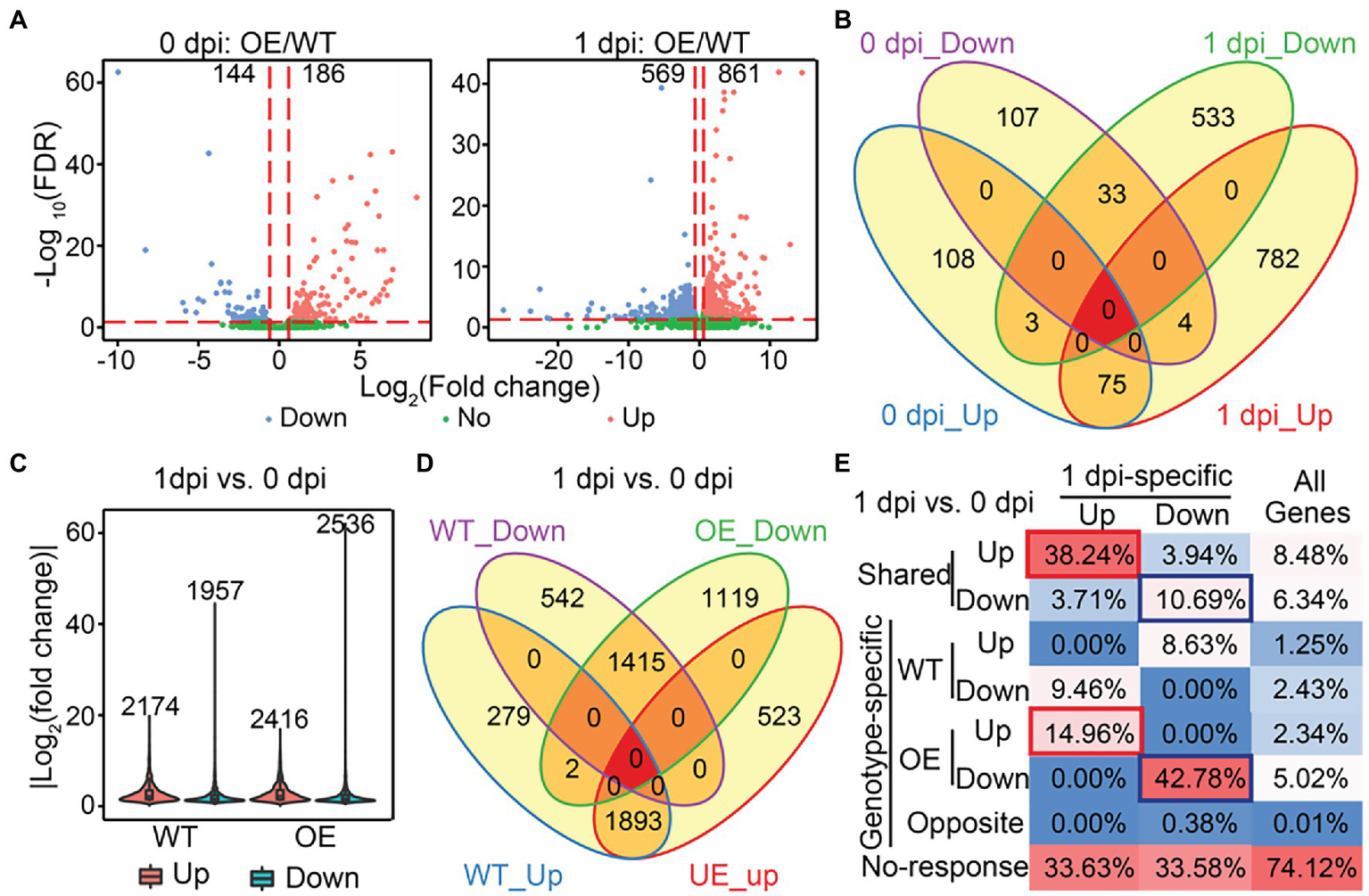 Identification of SlLecRK1-regulated genes during resistance to FORL inoculation. (A) Volcano plots of the transcriptional changes were generated using edgeR. The log2 of the fold change is shown on the horizontal axis, and the -log10 of the adjusted value of p (FDR) is shown on the vertical axis. Red and blue dots represent significantly upregulated and downregulated genes, respectively. Green dots are genes with a non-significant change. The vertical and horizontal red dashed lines indicate the cutoff of the log2-transformed fold change and -log10 of the FDR. Numbers indicate the counts for genes showing upregulation and downregulation. (B) A Venn diagram showing the numbers of upregulated and downregulated genes between OE-1 and WT plants at 0 and 1 dpi. (C) The numbers and fold change distributions of DEGs regulated by FORL inoculation in WT and OE-1 plants. (D) A Venn diagram showing the comparison of DEGs induced by FORL inoculation between WT and OE-1 plants. (E) The categories and percentages of 1dpi-specific upregulated and downregulated genes according to the DEGs caused by FORL inoculation in WT and OE-1 plants. Red and blue boxes indicate type I and type II target genes, respectively. “All genes” indicates genes that were subjected to differential expression analysis.
