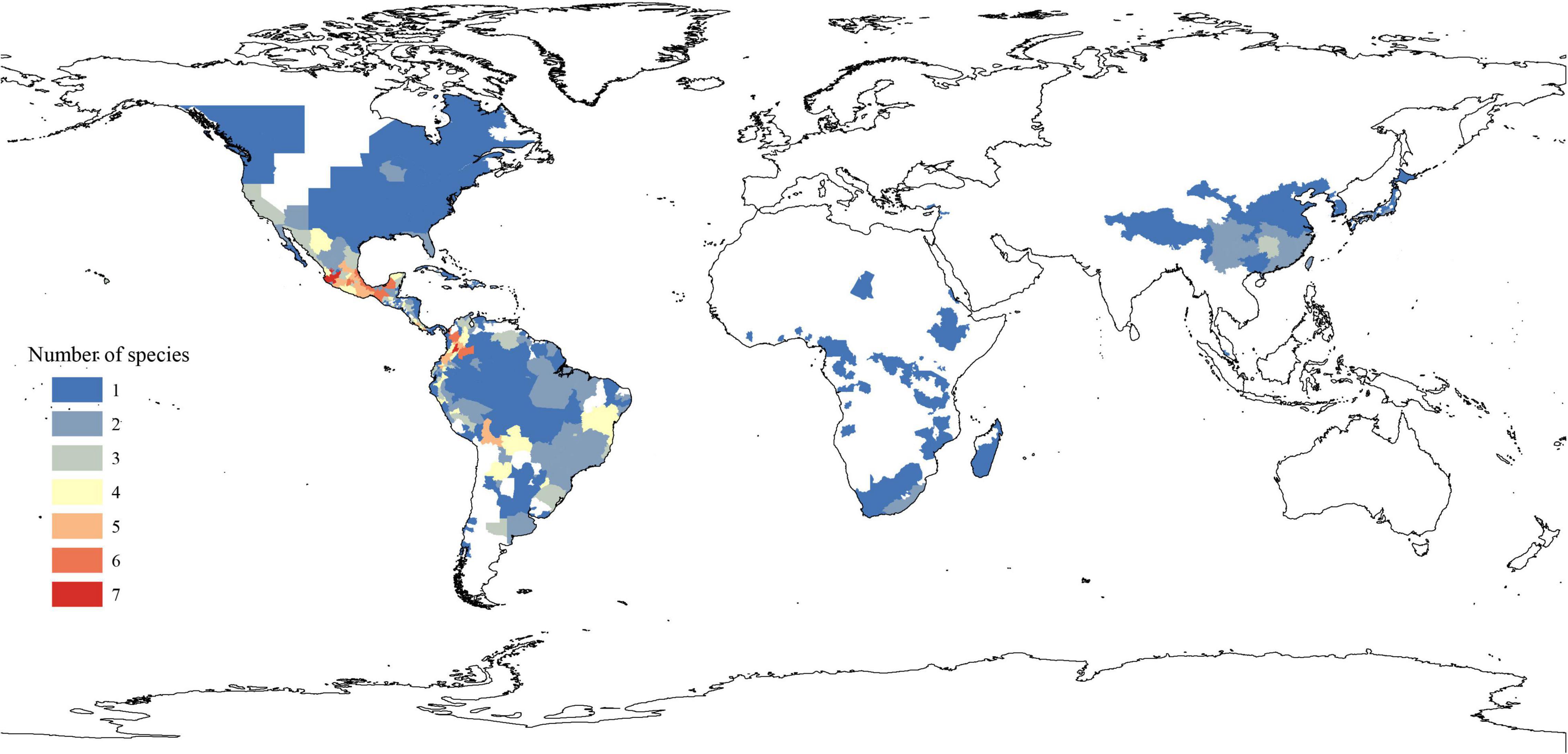 To construct the distribution patterns of species diversity, we divided countries that are larger than 200,000 km2 into smaller units (e.g., into official administrative units of each country, such as provinces or states). For each of these administrative units, we examined and recorded the number of Phytolacca species within them.