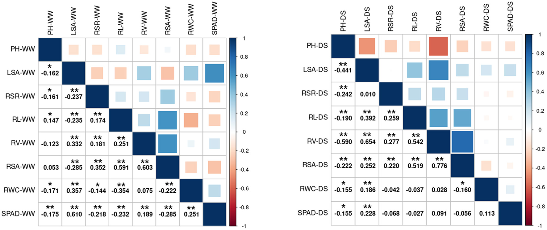 Spearman's correlation analysis between the 8 drought-related traits under two water condition. Left: Under WW growth condition. Right: Under DS growth condition. WW, well-water growth condition; DS, drought-stress growth condition; PH, plant height; LSA, leaf surface area; RSR, Root shoot ratio; RL, Root length; RV, Root volume; RSA, Root surface area; RWC, Relative water content; SPAD, SPAD value. * and **Significant at the 0.05 and 0.01 probability levels between genotypes, respectively.