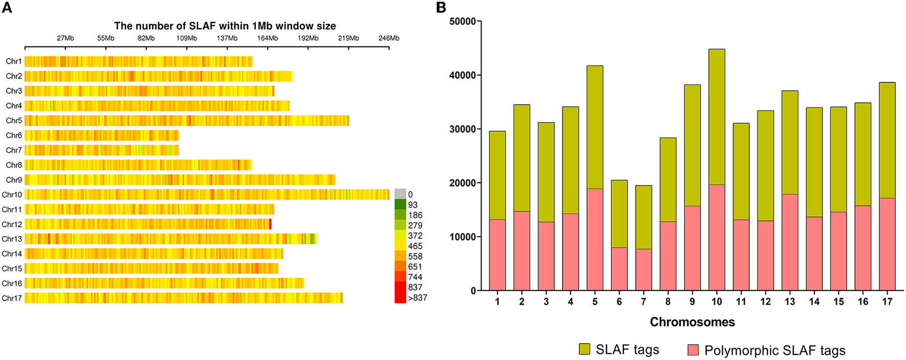 Specific length amplified fragments (SLAF) tags distribution. (A) Distribution of all 565,668 SLAF tags on sunflower genome based on 226 accessions. The colors indicate the number of SLAF tags within a 1 Mb window. (B) The number of SLAF tags and polymorphic SLAF tags on each chromosome.