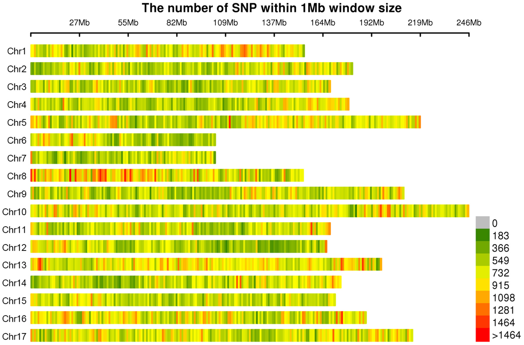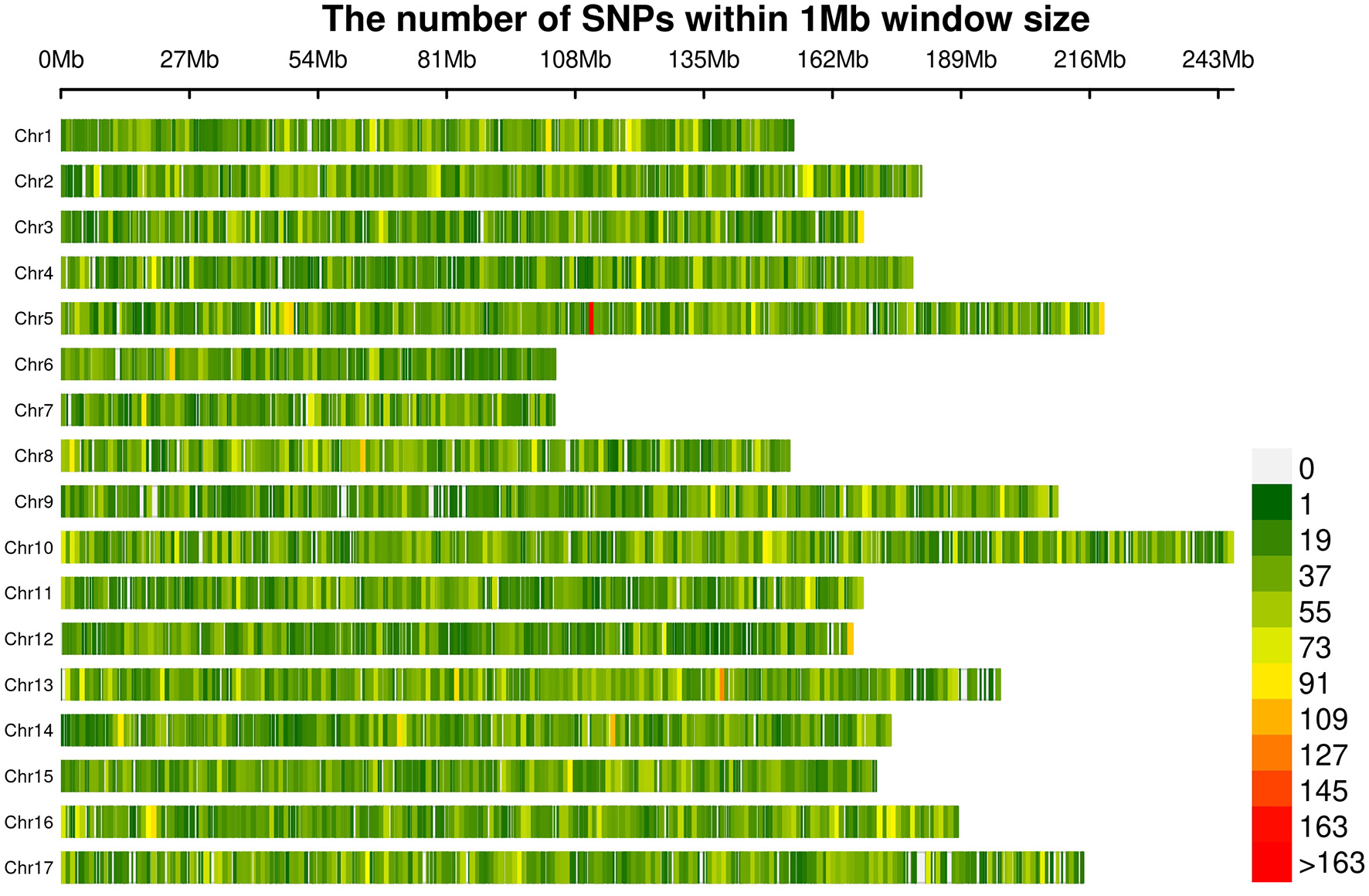 Distribution of filtered SNPs among the 17 chromosomes. The colors indicate the number of SNPs within a 1 Mb window.