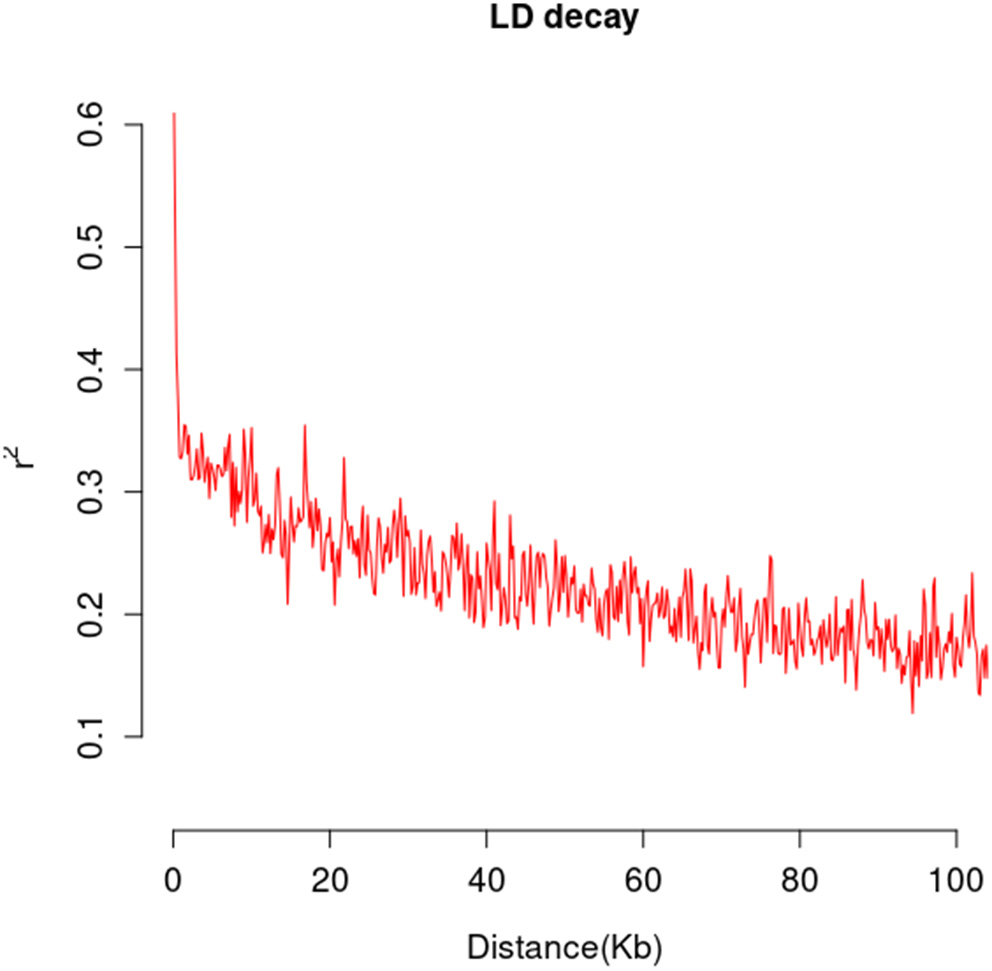 The mean LD decay rate was estimated by the squared allele frequency correlations (r2) using all pairs of SNPs located within 100 kb of physical distance in genomic regions in a population of 226 sunflower accessions.