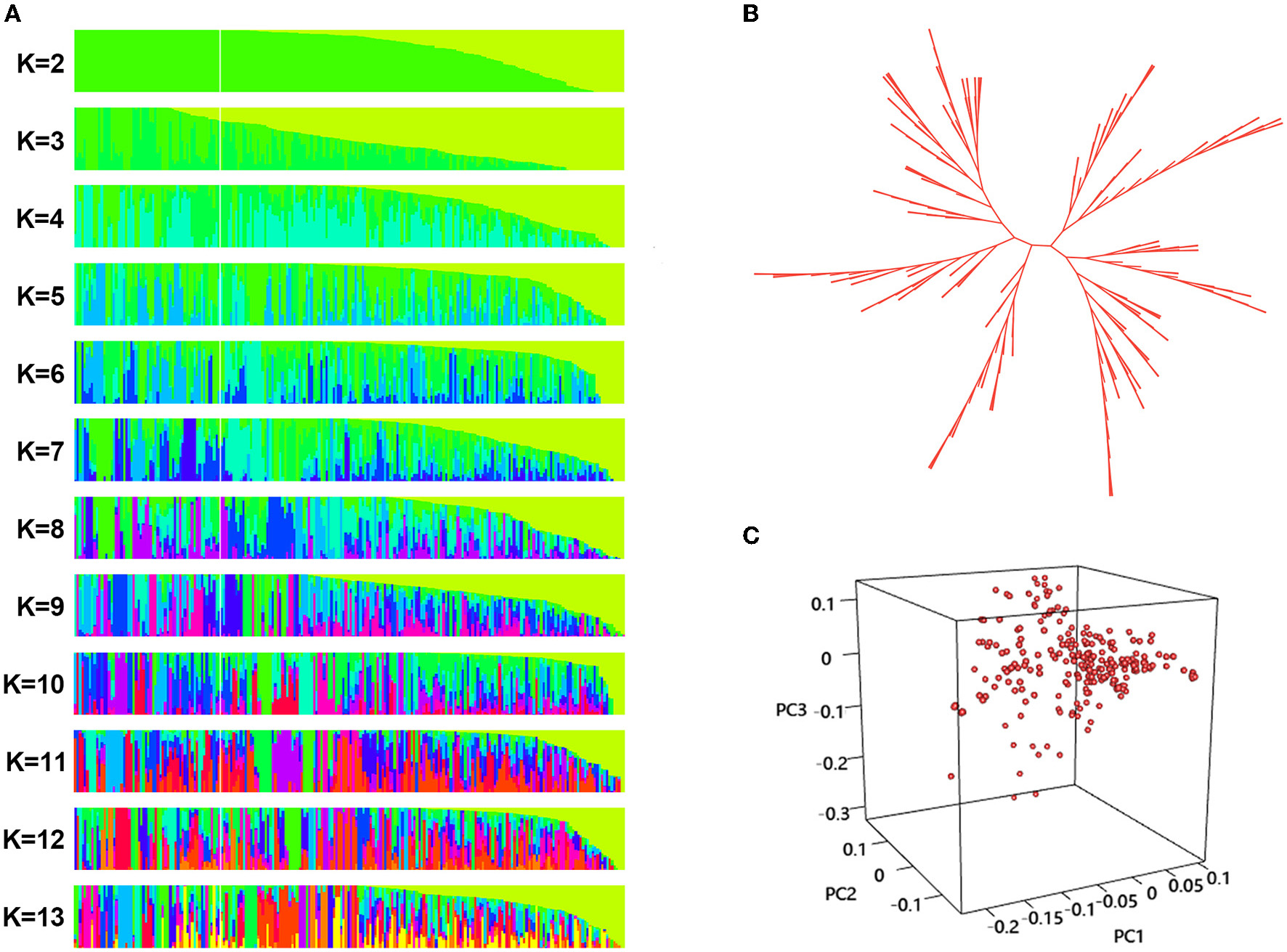 Population structure analysis phylogenetic tree construction, and principal component analysis (PCA) of the 226 sunflower accessions. (A) Population structure of sunflower accessions estimated by ADMIXTURE, each row represents a given number of clusters (K, K = 2–13), each vertical column represents one individual and each colored segment in each column represents the percentage of the individual in the population. (B) The unrooted neighbor-joining three a of 226 sunflower accessions. Each branch indicates a sample, and the length of the branches represents the genetic distance, (C) PCA scatter plots shows the distribution of 226 sunflower accessions defined by the eigenvectors of the first three principal components (PC). The three axes represent PC1, PC2, and PC3 respectively. Each dot represents a sample.