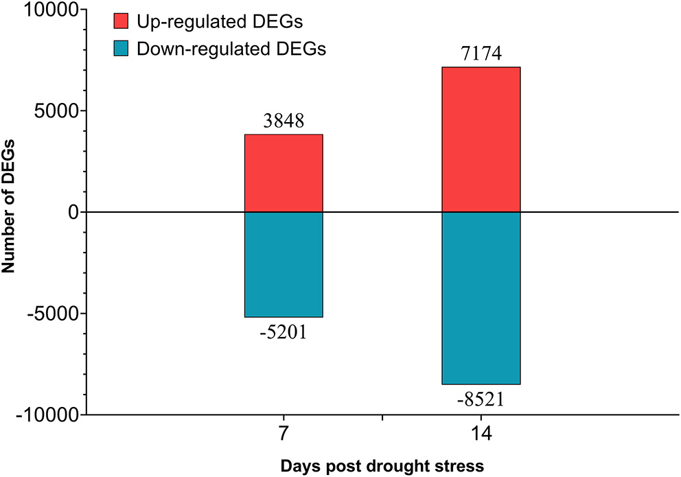 A total of 70 Gb clean data were obtained after filtering and quality control. The Q30 of each library ranged from 93.57 to 94.97%, and the GC content ranged from 44.86 to 45.68% (Supplementary Table 10). A total of 18,922 DEGs were obtained (Supplementary Table 11), 6,698 of them were newly discovered. In general, there were more DEGs under 14 days of drought stress compared with the 7 days, and down-regulated DEGs were more than up-regulated DEGs (Figure 9). From day-7 to day-14, the up-regulated DEGs were increasing from 3,848 to 7,174, whereas the down-regulated DEGs were increasing from 5,201 to 8,521, respectively.