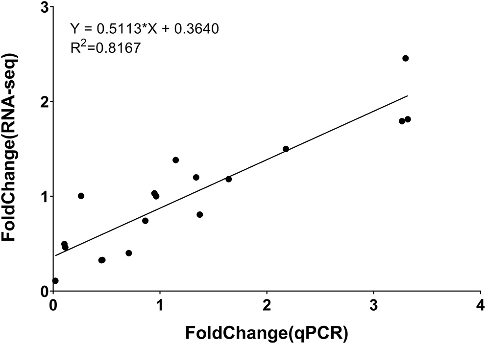 To validate RNA-seq results, reverse transcription quantitative PCR (RT-qPCR) was conducted on 6 randomly selected DEGs with three technical replicates. Experimental samples are the same as for RNA-seq. Reverse transcription was conducted using Biomarker Script II 1st Strand cDNA Synthesis Kit (Biomarker Technologies, Beijing, China) with Oligo d(T)23 VN as a primer, and qPCR reactions were performed with Biomarker 2X SYBR Green Fast qPCR Mix (Biomarker Technologies, Beijing, China) on the FTC-3000 qPCR system (Funglyn Biotech Inc., Toronto, ON, Canada). Gene expression levels were calculated using the method of 2−ΔΔCt according to Livak and Schmittgen (Livak and Schmittgen, 2001), and standard deviation was calculated among three biological replicates. The 18S rRNA gene was used as the endogenous control (Ebrahimi Khaksefidi et al., 2015).