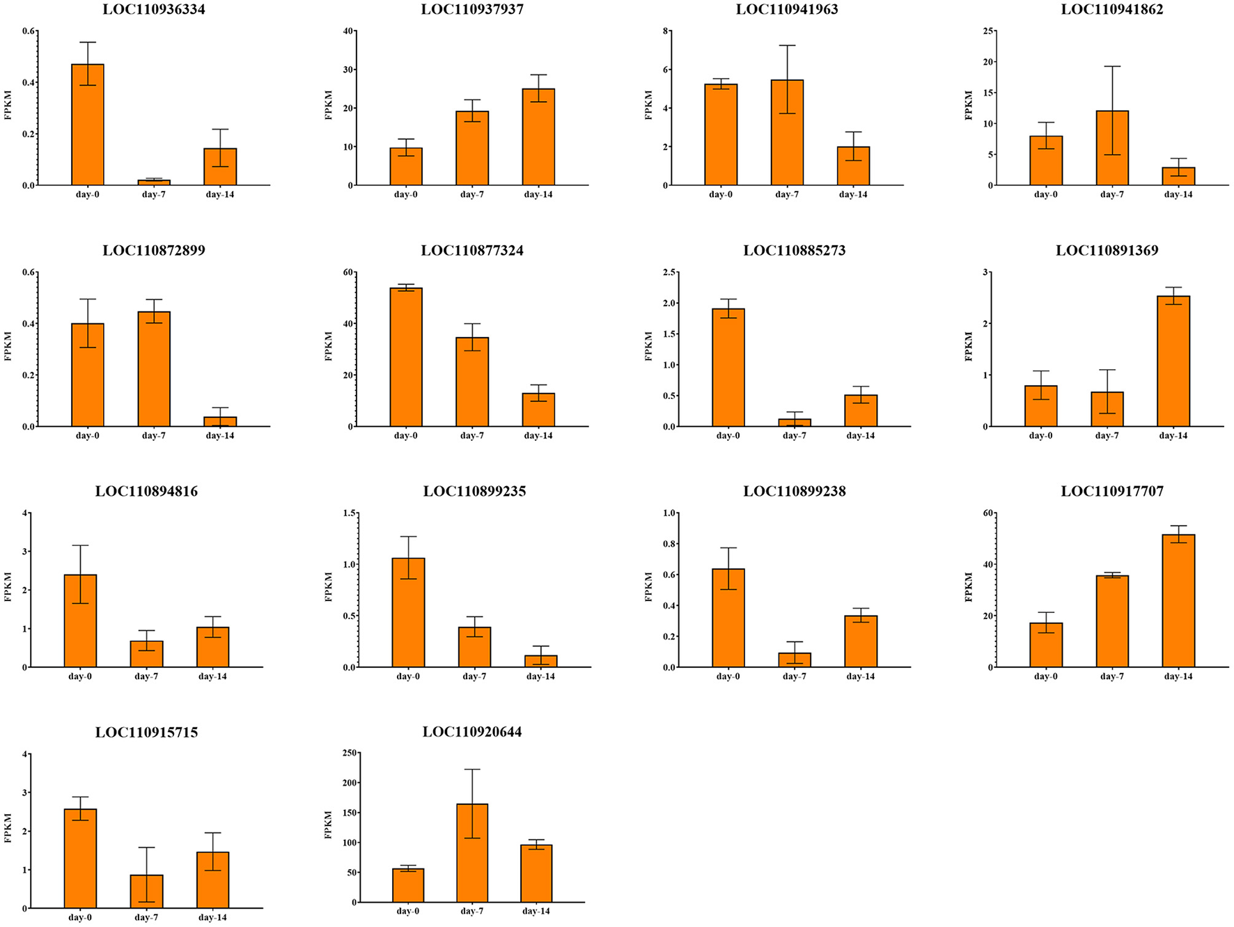 A python script [prepDE.py (https://ccb.jhu.edu/software/stringtie/dl/prepDE.py)] was used to generate a gene count matrix from the GTF file of each sample. Normalization and differential expression analysis were performed using DESeq2 R packages (Love et al., 2014). By default, DESeq2 computes a Benjamini-Hochberg adjusted p-value (Padj) to control the false discovery rate (FDR) (Anders and Huber, 2012). The “Fold Changes” of a gene is the FPKM ratio at day 7 (or 14) to that at day 0. For comparison purposes, we take the logarithm of the fold change and calculate the absolute value (|log2(Fold Changes)|). The |log2(Fold Changes) | of a gene equal to 1 means that the expression level of this gene has doubled or halved. Genes with Padj ≤ 0. 01 and |log2(Fold Changes) | ≥ 1 was considered as DEG.