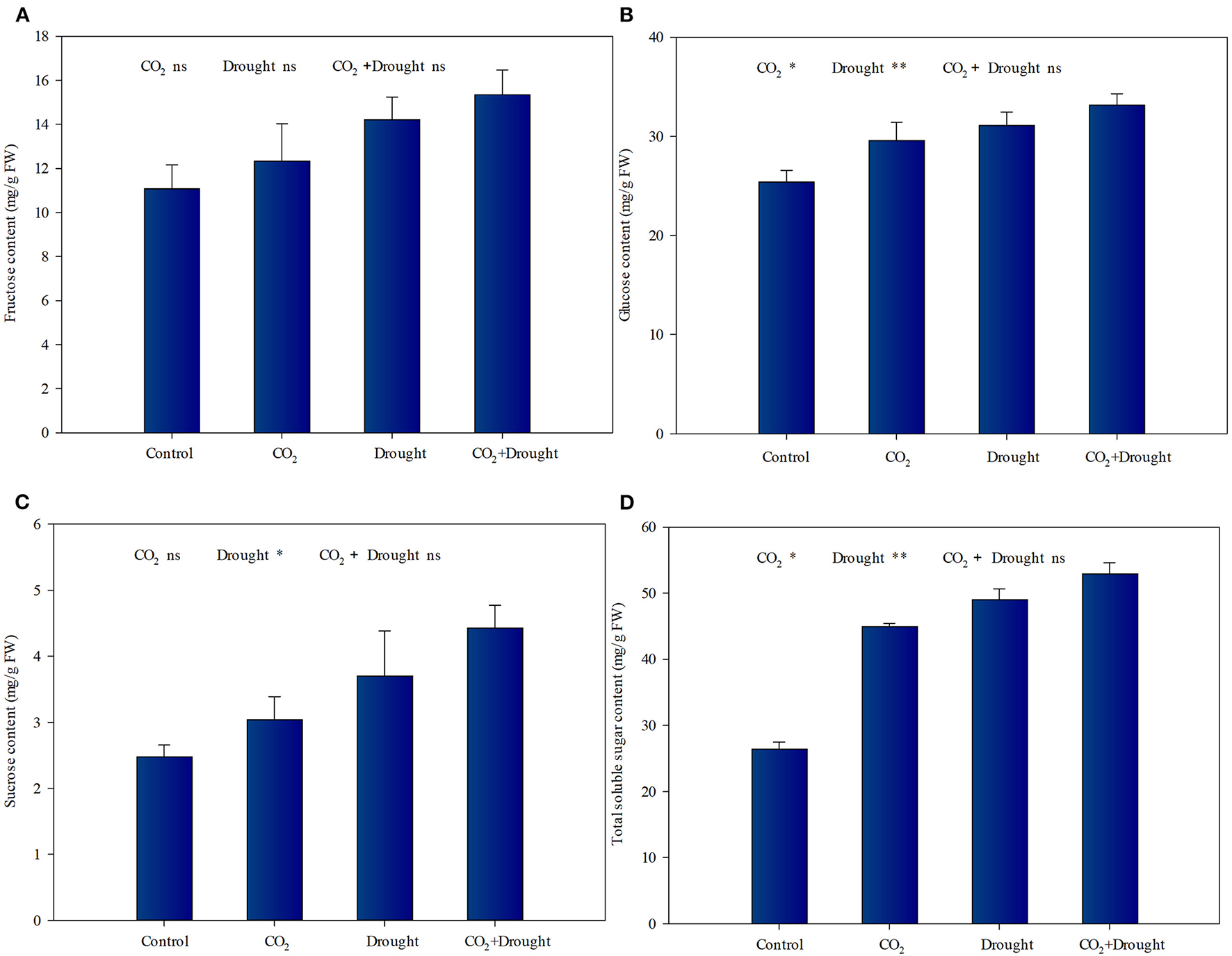 Soluble sugars content of Triticum aestivum grown under elevated CO2 and drought conditions. (A) fructose; (B) glucose; (C) sucrose; (D) total soluble sugars. Each value shown represents the mean (±SE) of three replicates. P-values are provided for two-way ANOVA on the effects of elevated CO2 and drought treatments on soluble sugar content. Significant differences: *P < 0.05; **P < 0.01; ns, P > 0.05.