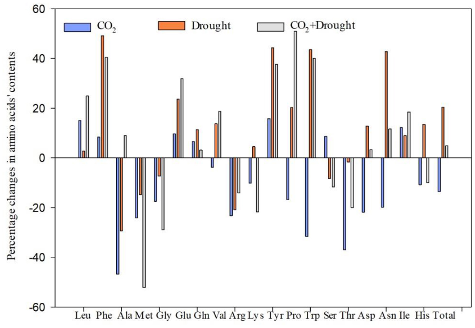 Their opposing effects on total amino acid contents as well as most of the other test amino acids (17 of 19) in wheat of elevated CO2 and drought did not show interaction, except for two amino acids, Ala and Try. The interaction indicated the existence of a potential crosstalk in which they both participate and a more complicated mechanism of change patterns in certain amino acids and proteins under combined elevated CO2 and drought treatment.