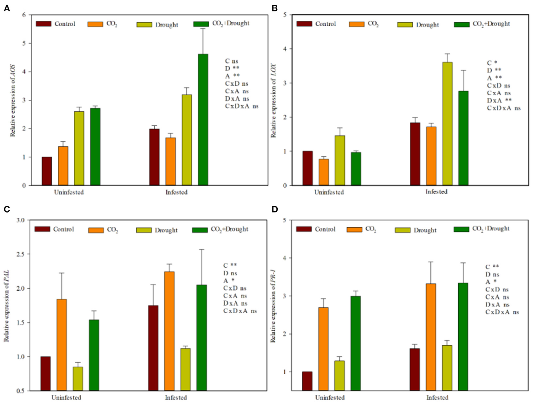 JA- and SA-related gene expression of Triticum aestivum grown under elevated CO2 and drought conditions with and without aphid infestation. (A)allene oxide synthase (AOS); (B)Lipoxygenase (LOX); (C)phenylalanine ammonia lyase (PAL), (D)pathogenesis-related protein 1 (PR-1). Each value shown represents the mean (±SE) of three replicates. P-values are provided for three-way ANOVA on the effects of elevated CO2(C), drought (D), and aphid (A) treatments on JA- and SA-related gene expression. Significant differences: *P < 0.05; **P < 0.01; ns, P > 0.05.