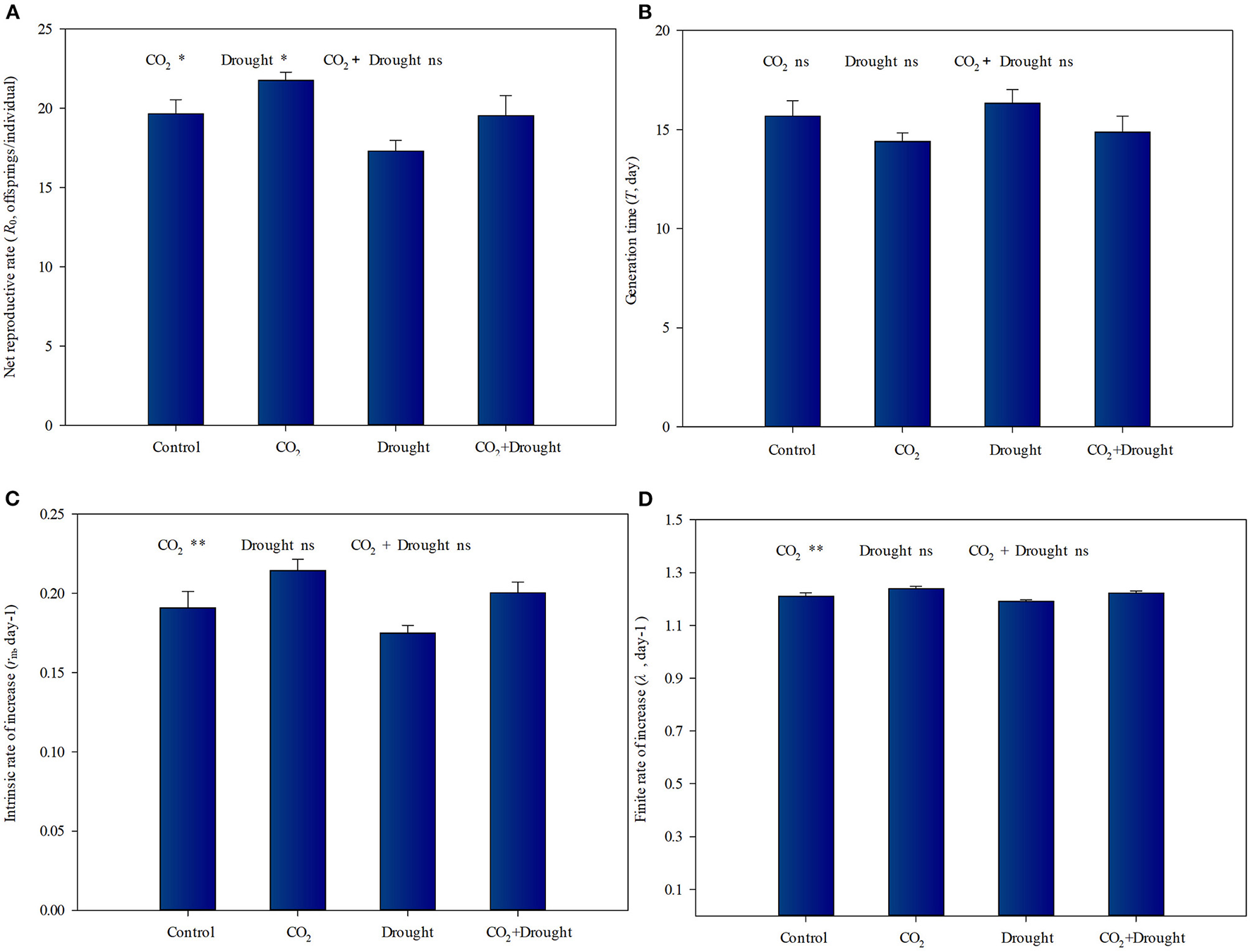 Life table parameters of aphid reared on Triticum aestivum grown under elevated CO2 and drought conditions. (A) net reproduction rate (R0); (B) generation time (T); (C) intrinsic rate of increase (rm); (D) finite rate of increase (λ). Each value shown represents the mean (±SE) of three replicates. P-values are provided for two-way ANOVA on the effects of elevated CO2 and drought treatments on life table parameters. Significant differences: *P < 0.05; **P < 0.01; ns, P > 0.05.