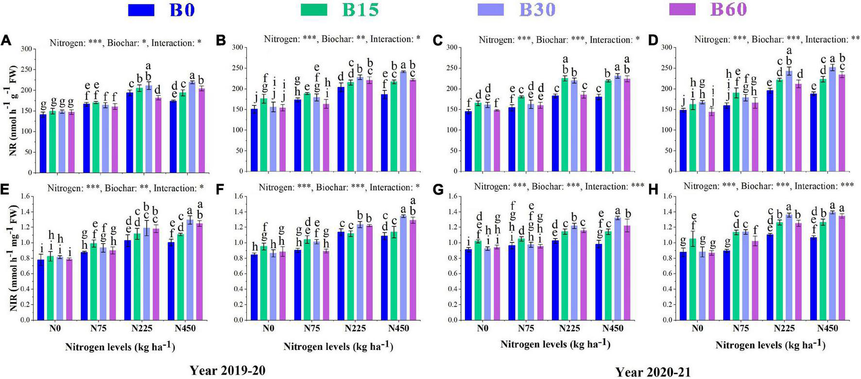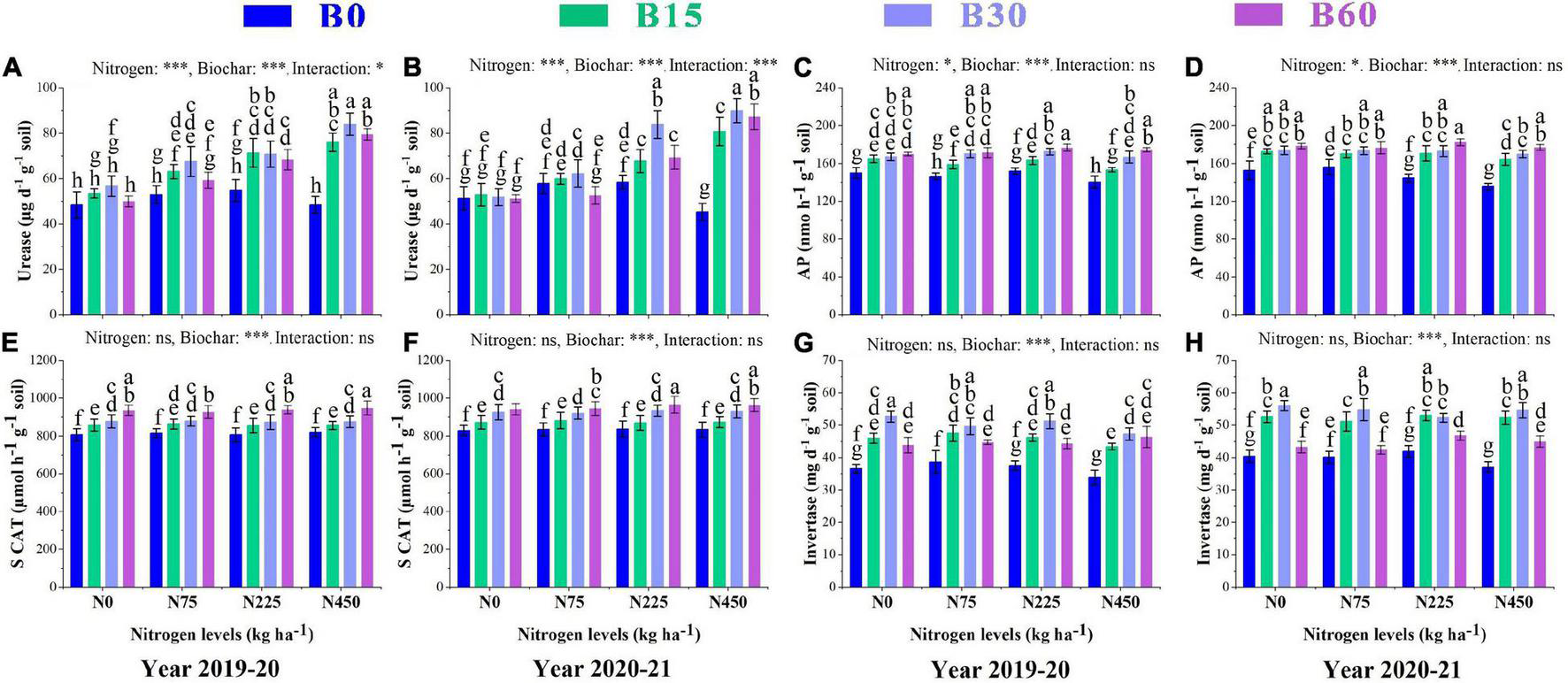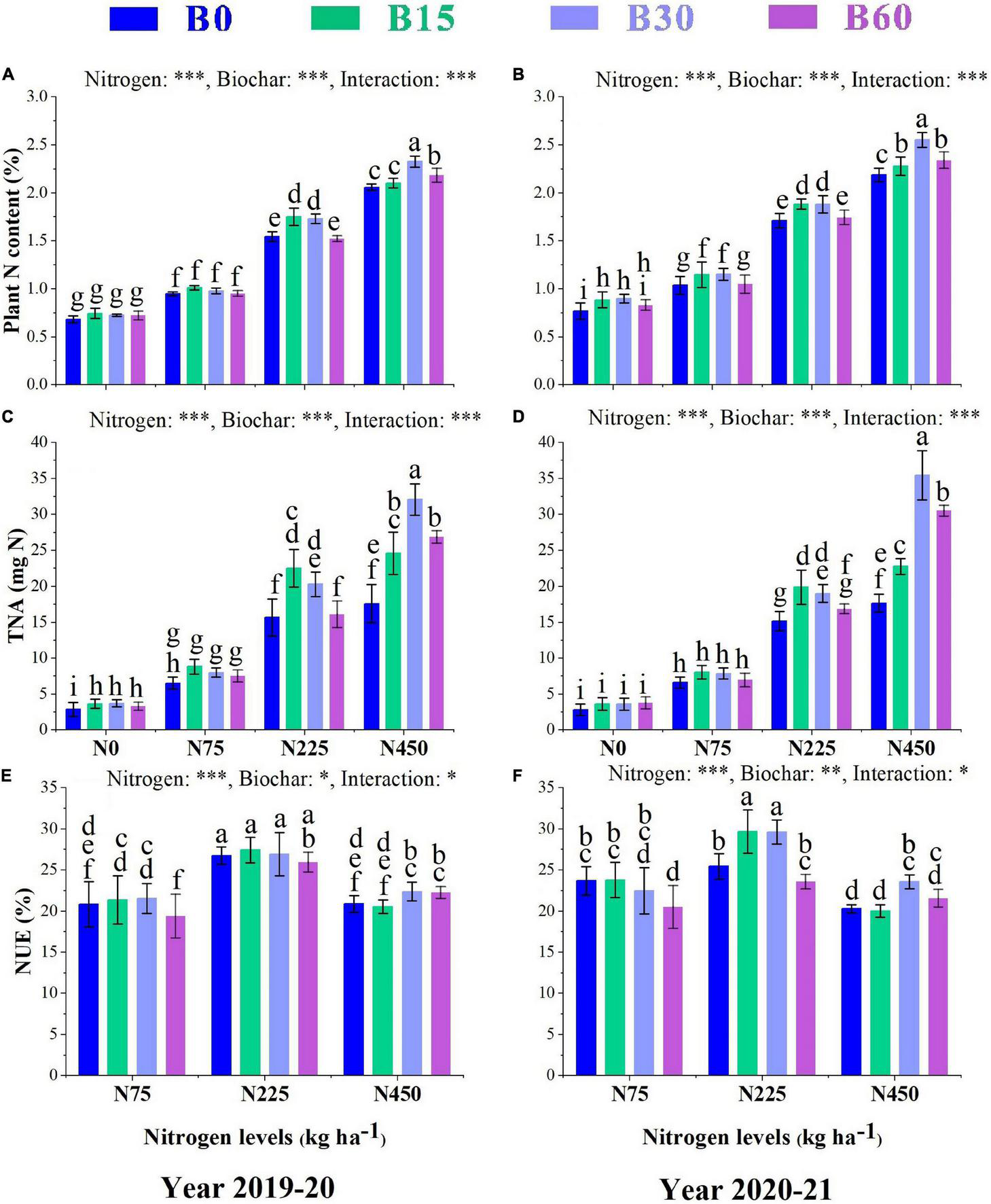 B0, 0 t ha–1 biochar; B15, 15 t ha–1 biochar; B30, 30 t ha–1 biochar; B60, 60 t ha–1 biochar; N0, 0 kg ha–1 nitrogen; N150, 150 kg ha–1 nitrogen; N300, 300 kg ha–1 nitrogen, and N450, 450 kg ha–1 nitrogen. SOC, soil organic carbon; NO-N, nitrate nitrogen; NH-N, ammonium nitrogen; TP, total phosphorus; and AK, available potassium. Different letters within the columns show a significant difference between the treatments at p = 0.05 according to the LSD test, and asterisks represent a significant difference at *p < 0.05, **p < 0.01, ***p < 0.001 level; ns, not-significant.