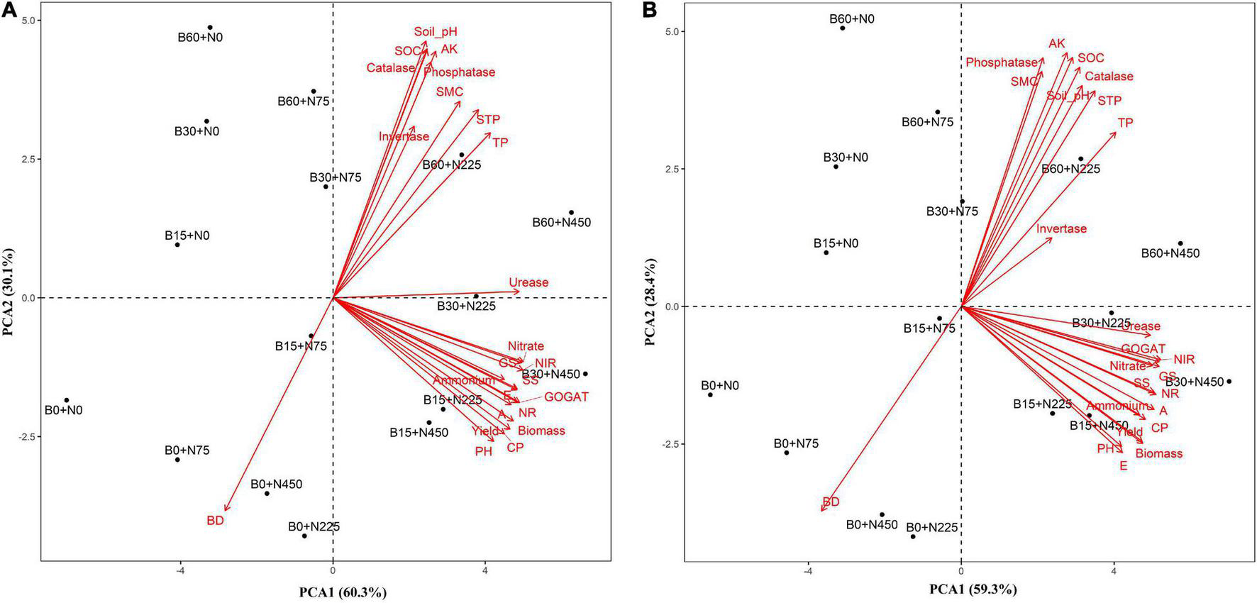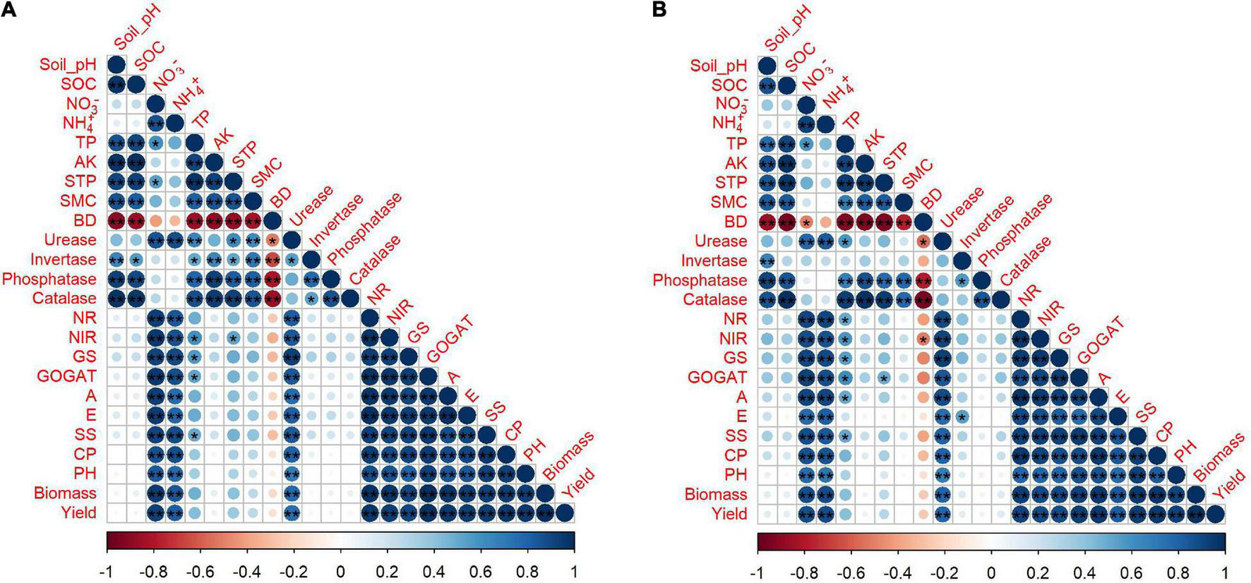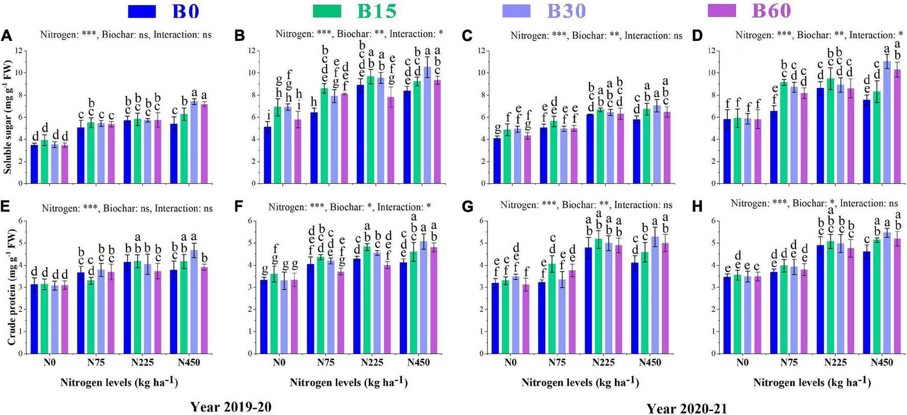 B0, 0 t ha–1 biochar; B15, 15 t ha–1 biochar; B30, 30 t ha–1 biochar; B60, 60 t ha–1 biochar; N0, 0 kg ha–1 nitrogen; N150, 150 kg ha–1 nitrogen; N300, 300 kg ha–1 nitrogen, and N450, 450 kg ha–1 nitrogen. SOC, soil organic carbon; NO-N, nitrate nitrogen; NH-N, ammonium nitrogen; TP, total phosphorus; and AK, available potassium. Different letters within the columns show a significant difference between the treatments at p = 0.05 according to the LSD test, and asterisks represent a significant difference at *p < 0.05, **p < 0.01, ***p < 0.001 level; ns, not-significant.
