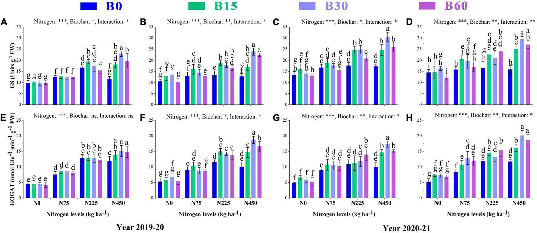 The preferable forms of plant nitrogen uptake through roots are nitrate-nitrogen (NO-N) or ammonium-nitrogen (NH-N) (Miller and Cramer, 2005). Once the NO is taken up by plants, it is reduced to nitrite (NO) by nitrate reductase and then to ammonium ion (NH) by nitrite reductase (Xiong et al., 2018). The ammonium is further incorporated by glutamine synthetase and glutamate synthase into glutamic acid, which supplies nitrogen to produce essential amino acids and proteins (Shah et al., 2017). Plant N content and concentrations of amino acids are primarily increased upon higher nitrogen fertilizer supply (Luo et al., 2008), but the effect of nitrogen use efficiency remained insignificant due to the hostile impacts of high nitrogen fertilization on soil and plant. The conventional application of high nitrogen fertilizers increases crop yields (Bitew and Alemayehu, 2017); however, half of the applied nitrogen fertilizers are lost into the environment (Lassaletta et al., 2014), and thus negatively affecting the environment, soil fertility, and nitrogen use efficiency. Previously, several strategies under biochar addition have been explained the retention and utilization of applied nitrogen fertilizers such as adsorption of N to biochar, high cation or anion reactions, and immobilization of N due to labile carbon of biochar (Clough and Condron, 2010).