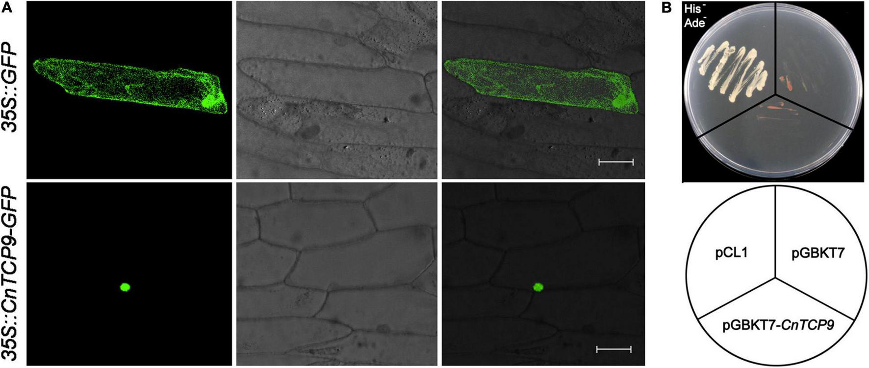 Figure 4. Subcellular localization and transcriptional activation. (A) Subcellular localization of CnTCP9 protein in the onion epidermis cells. Onion epidermis cells were transformed with 35S:GFP as a control; bar = 50 μm. (B) Transcriptional activation assays of CnTCP9 via yeast one-hybrid system.