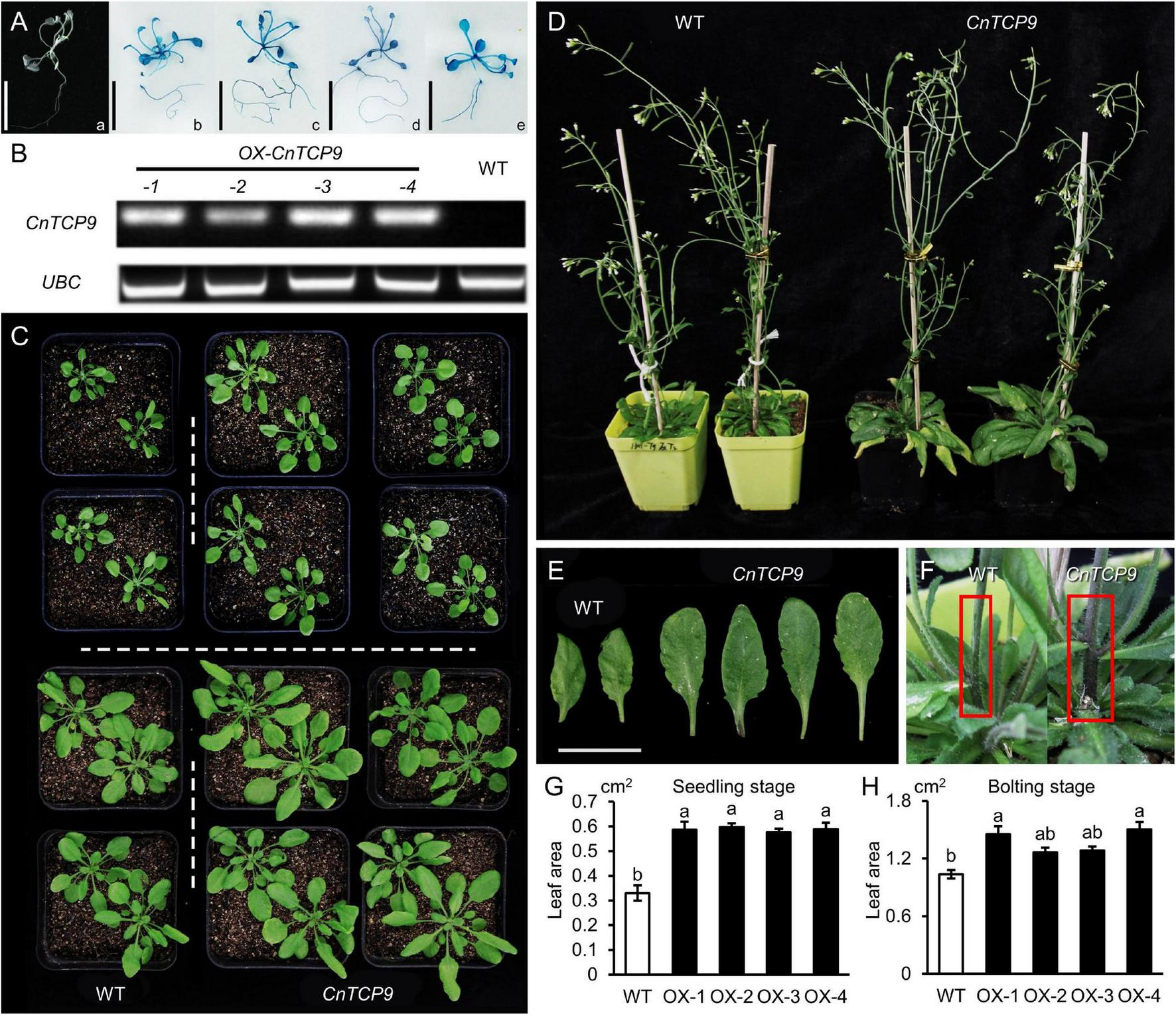 Figure 5. Phenotype of overexpressing CnTCP9 in Arabidopsis. (A) GUS staining of T3 generation. (a) Non-transgenic Arabidopsis was used as the negative control. (b–e) Transgenic CnTCP9 positive seedlings. (B) RT-PCR of CnTCP9 in WT and OE (Overexpressing CnTCP9 Arabidopsis). (C) Germination period and seedling period of WT and OE. (D) Mature period of WT and OE. (E) Leaves of WT and OE; bar = 2 cm. (F) The main stem of WT and OE. (G,H) Statistics of mature leaf area of WT and OE. Data are means ± SD. The different letters represent the values significantly different at p < 0.01 according to the one-way ANOVA test.
