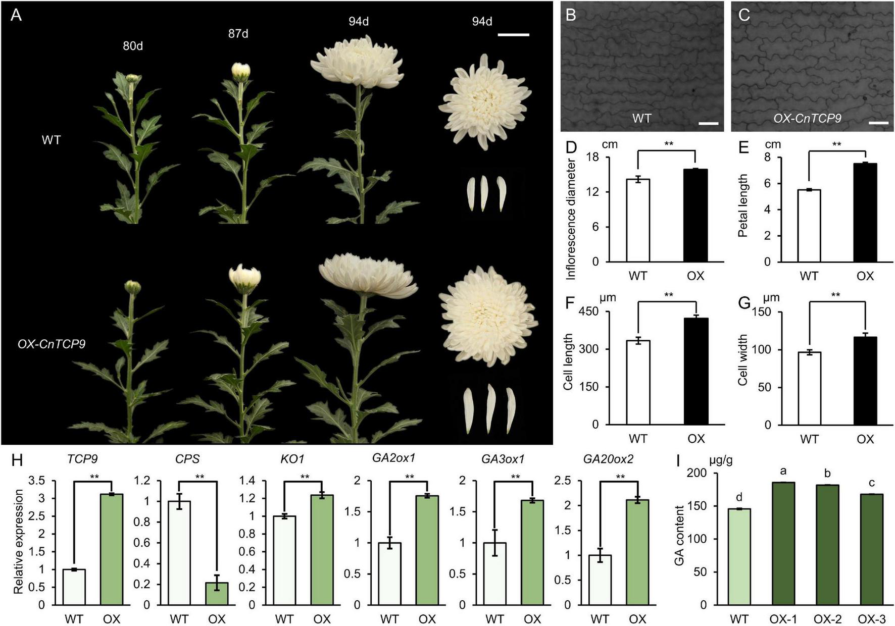 Figure 6. Phenotype of overexpressing CnTCP9 in chrysanthemum. (A) Phenotypes of WT and OX-CnTCP9 transgenic plants at 80 d, 87 d, and 94 d after planting in the field; bar = 5 cm. (B,C) Cells of the middle regions of petals at blooming stage in WT and OX-CnTCP9 transgenic C. morifolium plants; bar = 170.0 μm. (D) Inflorescence diameter of WT and OX-CnTCP9 transgenic plants. (E) Petal length of WT and OX-CnTCP9 transgenic plants. (F,G) Statistics of petal cell length and width of WT and OX (Overexpressing CnTCP9 C. morifolium). Data are means ± SD. Two asterisks represent the values significantly different at p < 0.01 according to the t-test. (H) qRT-PCR analysis of GA pathway genes in WT and OX. Data are means ± SD. Two asterisks represent the values significantly different at p < 0.01 according to the t-test. (I) Statistics of GA3 content of WT and OX. Data are means ± SD. The different letters represent the values significantly different at p < 0.01 according to the one-way ANOVA test.