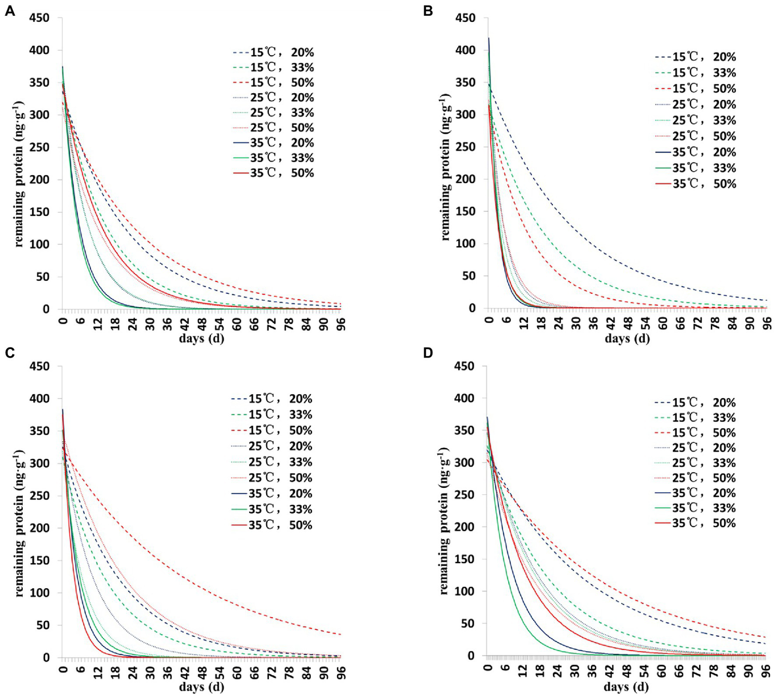 Figure 2. The degradation dynamics of Cry1Ah protein in the soil in four soil types under different environmental conditions. The data were calculated following degradation model Y = Y0 + ae−b*X. (A) Gongzhuling, (B) Jinan, (C) Beijing, and (D) Zhengzhou; temperature (15°C, 25°C, and 35°C), water content (20, 33, and 50%).