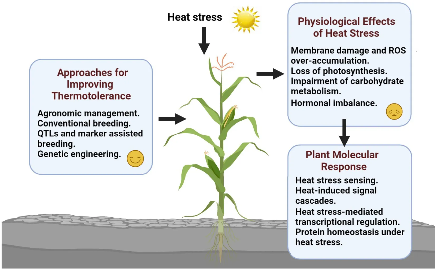 This review summarized heat stress-mediated morphological and physiological changes in maize and elucidated the molecular mechanisms responsible for maize response to heat stress. Furthermore, plausible approaches to dissecting the regulatory network associated with heat stress response and improving maize adaptation to global warming have been discussed. This figure was made using BioRender.