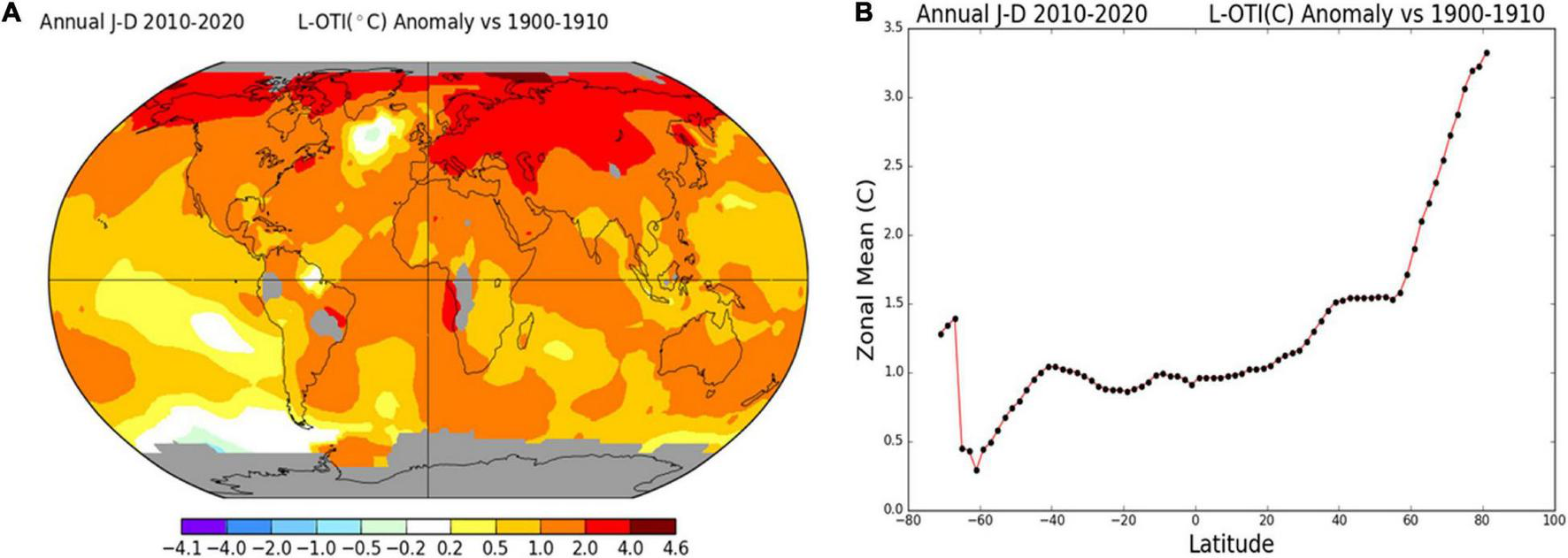 (A) Map of annual mean temperature change (°C) during 1900–1910 and 2010–2020. (B) The zonal means plot. Air temperature data of the land surface was retrieved from GHCNv4 (GISS analysis based on global historical climatology network v4), and sea surface temperature data was retrieved from ERSST_v5 (NOAA/NCEI’s extended reconstructed sea surface temperature v5). The number at the top right-hand corner of the map plot is an estimate (°C) of the global mean of the calculated area. The maps were made using GISS Surface Temperature Analysis software (https://data.giss.nasa.gov/gistemp/maps/index.html).