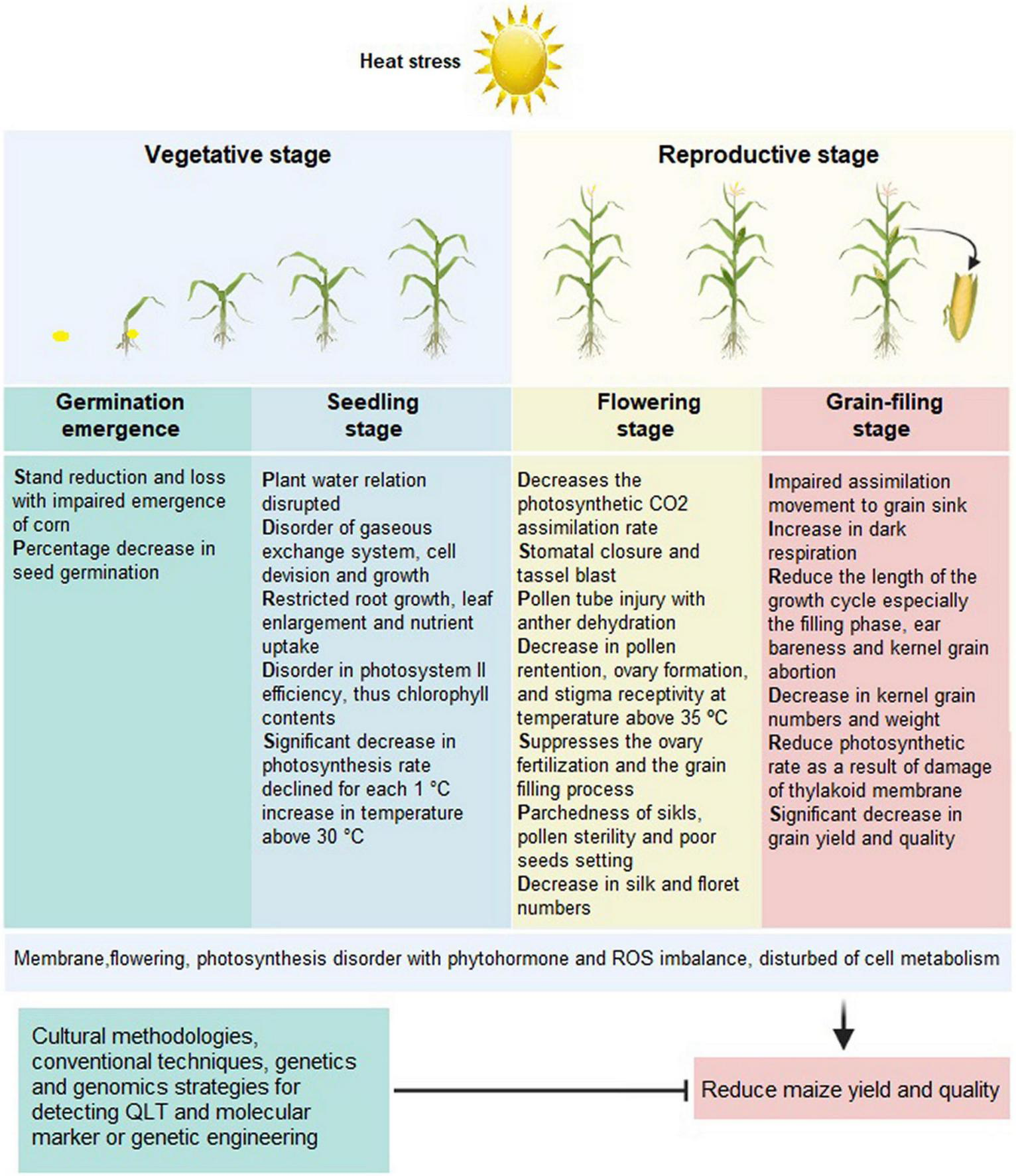 Technically, the growth of stems, leaves, and roots, usually referred to as vegetative growth, is also known as germination, leaf, and tasseling (Dolatabadian et al., 2010). Heat stress affects the abovementioned growth stages (Figure 2) significantly. Also, the optimum soil temperature for maize seeds germination is 21°C, whereas <13°C causes a severe stoppage in germination and <10°C causes a total cessation (Kaspar and Bland, 1992; Towil, 2010; Sánchez et al., 2014). The germination rate of spring sowing of maize seeds cultivated in higher altitudes, such as North Europe and North America, is comparatively low due to low soil temperature (Paul et al., 1996). Early seed germination may expose the crop to freezing temperature, and early flowering leads to short crop duration leading to severe yield loss (Jagadish et al., 2016). However, late cultivation for optimum temperature conditions caused a severe loss in yield due to pest attacks (Rosenzweig et al., 2001). Therefore, only the day-neutral spring maize is favorably cultivated in higher altitudes (Colasanti and Muszynski, 2009).
