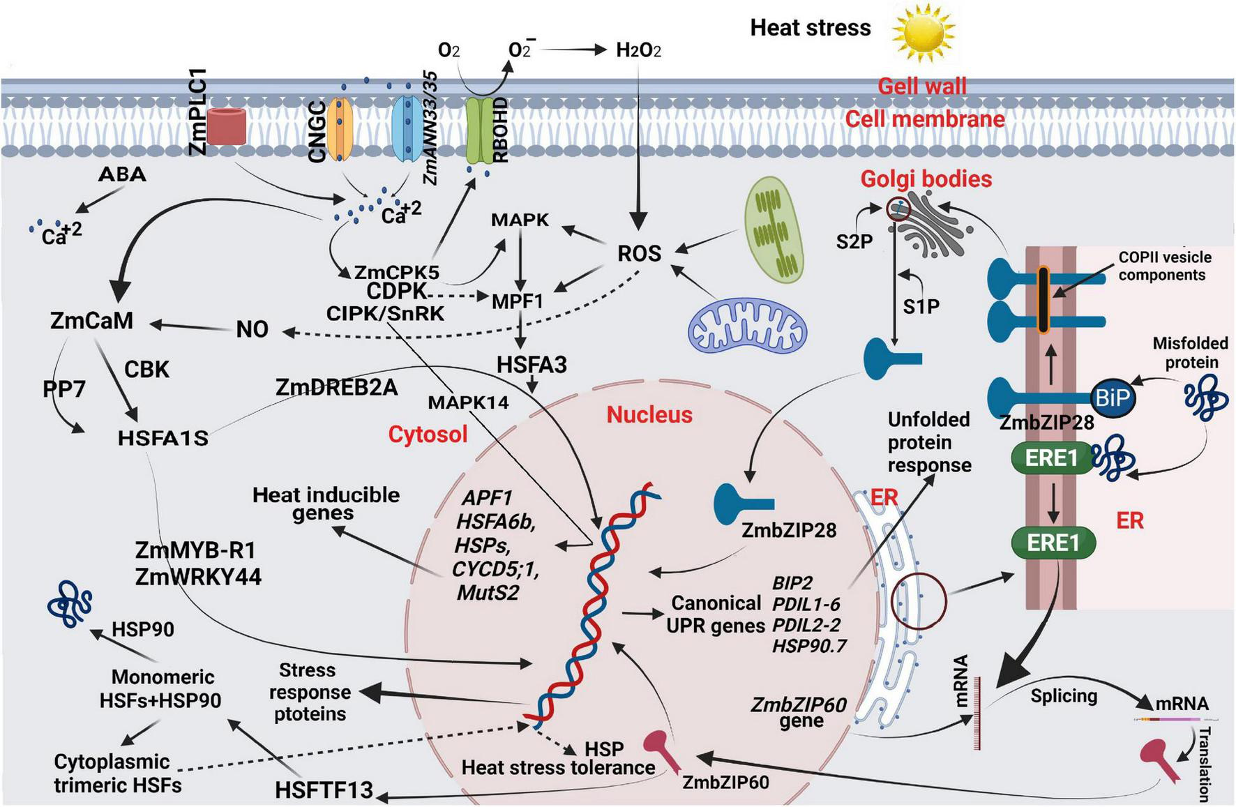 A heat stresses responsive regulatory network in maize. Heat stress damages the cell membrane when exposed to heat stress and promotes the release of apoplastic Ca2+. Heat stress disturbs the plasma membrane’s fluidity and permeability, resulting in a loss in function of chloroplasts and mitochondria, higher cytosolic Ca2+, ROS, NO, and over-accumulation of misfolded or unfolded proteins. Increased cytosolic Ca2+, ROS, and NO are secondary messengers and stimulate downstream regulatory networks. Heat stress disrupts protein homeostasis, inducing unfolded-protein response (UPR) and signaling pathways mediated by IRE1-ZmZIP60 and ZmZIP28. The ZmZIP60 activates the expression of a type-A HSF and HSFTF13, which upregulates the expression of HSP genes, i.e., Hsp90. The Ca2+ signaling is essential in heat tolerance of seed-set in maize under field conditions, where calcium, a critical secondary messenger, converges signals transmitted from high temperature, membrane fluidity, calcium efflux, and ABA (among others), amplifying them through the activation downstream of genes, such as HSFA6b, ABF1, CYCD5;1, MutS2, and HSPs during reproductive stage via the MAPK pathway, and eventually enhance maize tolerance to heat stress for seed-set. This figure was made using BioRender.