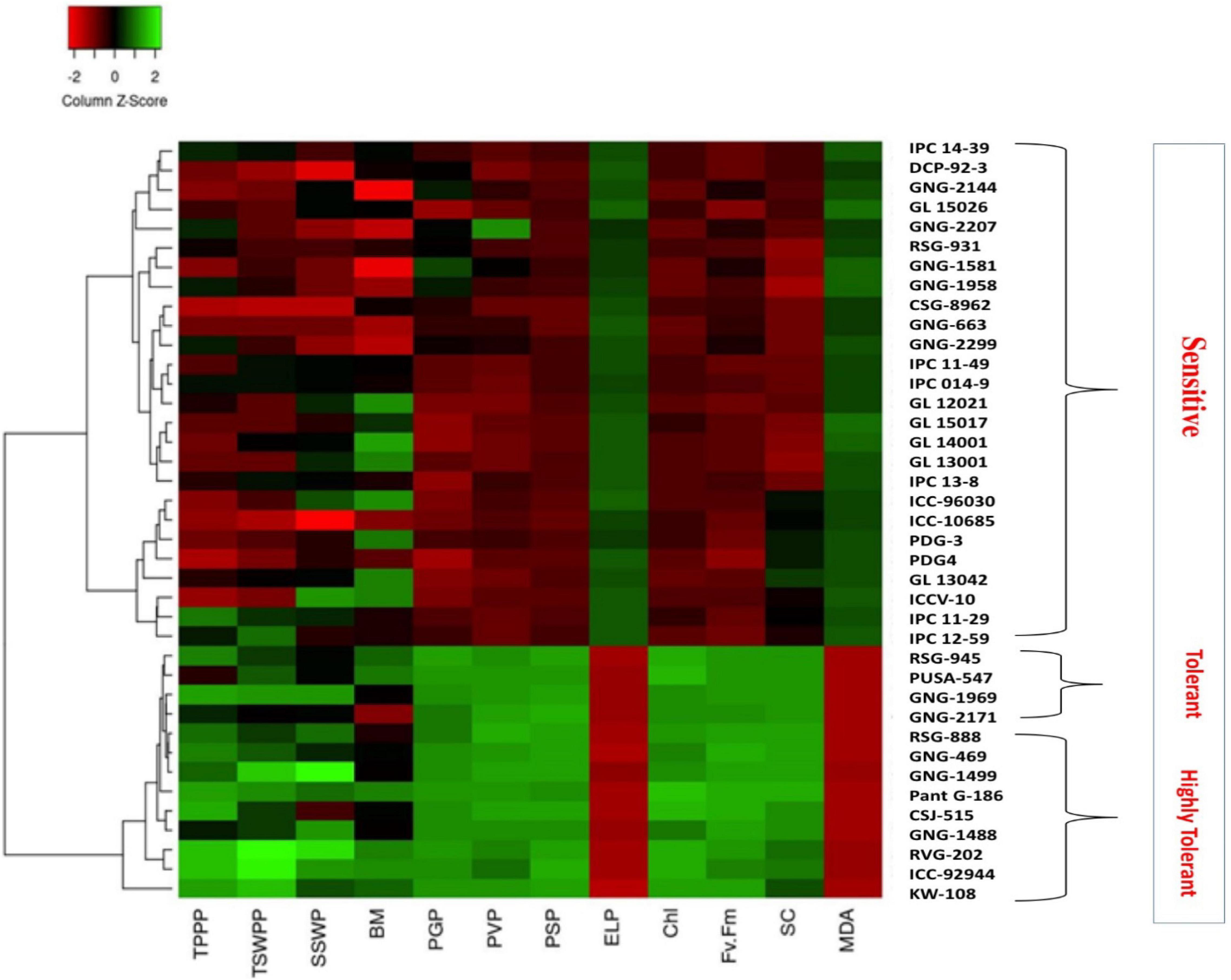 Here, we phenotyped 39 chickpea genotypes to identify sources of HS tolerance by exposing them to HS in the field and a growth chamber during heat-sensitive stages. We identified potential heat-tolerant chickpea donors with high pod set and grain yield, high chlorophyll content, PVP, PGP, photosystem II efficiency, and low MDA and EL% under HS.