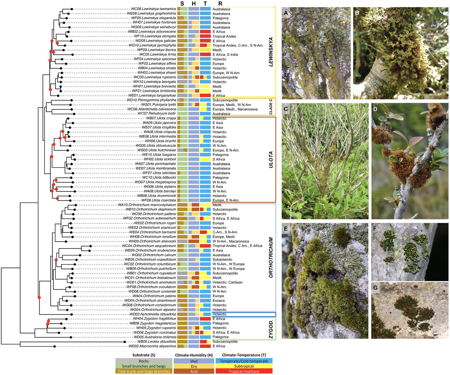 Ecological and biogeographical affinities of the species in the phylogenetic framework (IQ-TREE analysis). For each species, the following information is shown sorted by columns: S—substrate preferences; H—Climate-Humidity, i.e., degree of humidity of the climatic environment in which the species usually grows; T—Climate-Temperature, i.e., degree of climatic thermicity according to the latitudinal climatic bands where the species thrive; R—geographical range. See Materials and Methods section for details on the environmental categories analyzed. Representative pictures: (A)Lewinskya spp. dominating communities on tree trunks from Bale Mts., Ethiopia; (B)L. graphiomitria on small branches from Mt. Egmont, North Is., New Zealand; (C)Plenogemma phyllantha on a shrub trunk and branches from coastal Olympic Peninsula, Washington, United States; and (D)Ulota fuegiana on shrub twigs from Beagle Channel, Patagonia, Chile. (E)Orthotrichum diaphanum dominating communities on tree trunk from Madrid, central Spain; (F)O. consobrinum on a tree trunk from Nara, Honshu Is., Japan; and (G)O. anomalum on a rock from Burgos, Spain. Abbreviatures: Medit.—Mediterranean Basin, N-Am.—North America; and C-Am.—Central America.
