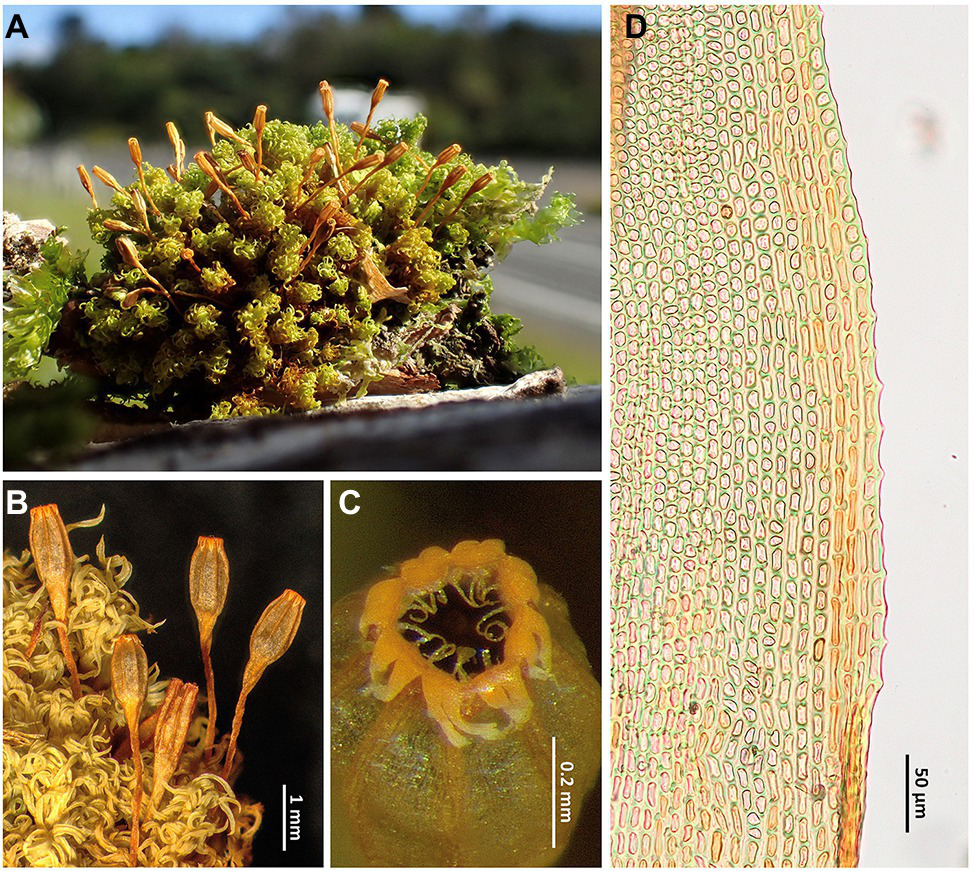 Rehubryum bellii. (A) General aspect of a dry cushion in the field. (B) Detail of the habit showing the upper leaves when dry and several sporophytes, most of them with mature, recently opened capsules. (C) Mouth of a capsule when dry, showing a peristome with 8 pairs of teeth, split almost to the base, and 16 well-developed segments. (D) Detail of the leaf lamina margin just above the basal leaf showing the submarginal band of elongated cells and the papillose marginal cells. (A) image taken in Mount Taranaki NP (Lara 1601/57, MAUAM); (A–C) from Garilleti 2016-045b (Garilleti’s personal Herb.); and D from Garilleti 2016–104 (Garilleti’s personal Herb.).