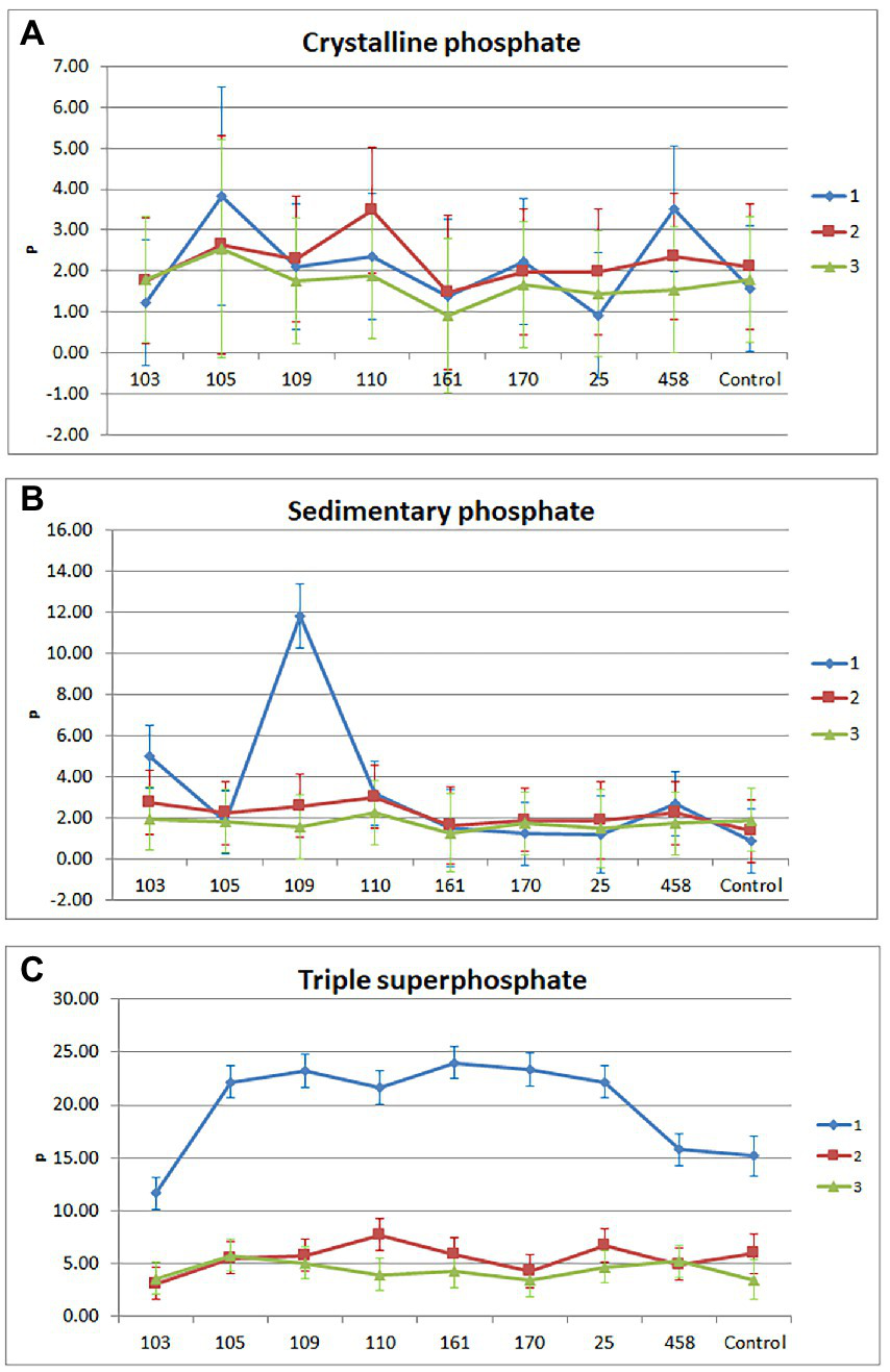 Phosphate fertilizers are among the most commonly used agrochemicals in agriculture, and the lack of adequate levels of these fertilizers is a limiting factor for plant growth (Crous et al., 2019). Therefore, plants usually receive soluble phosphorus through industrialized fertilizers. In addition, some phosphate rocks can be applied for direct soil fertilization (Ahemad and Kibret, 2014). First, however, it is necessary to transform this phosphorus into a soluble form for plants. Phosphate-solubilizing bacteria (PSB) transform this phosphorus by chelation, ion exchange, and organic acid production (Khan et al., 2009; Afzal et al., 2019). Among the types of insoluble phosphate rocks are the sedimentary rocks of Arad (33.0% P2O5) and the crystalline rocks of Cajati/SP (5.0% P2O5) (Alves and Hagni, 2008; Ramos et al., 2009).