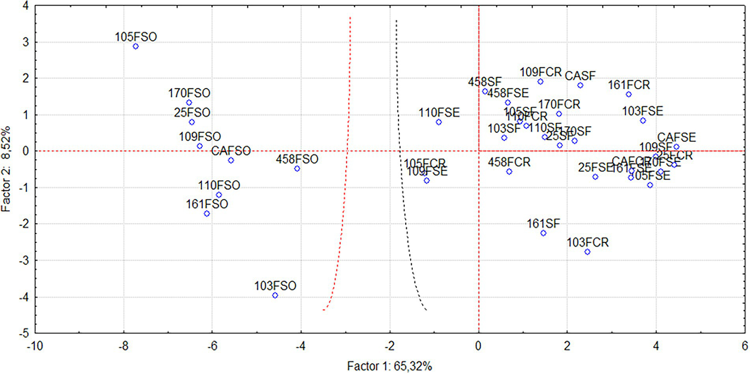 Thirty-two descriptors were evaluated: EP (phosphorus extract), EN (nitrogen extract), ECa (calcium extract), CP (crude protein), MM (mineral matter), LIG (lignin), Ca (calcium), Mg (magnesium), P (phosphorus), K (potassium), S (sulfur), Mn (manganese), Zn (zinc), N (nitrogen), SPAD (SPAD index), AFW (aerial fresh weight), ADW (aerial dry weight), LW (leaf width), NL (number of leaves), NT (number of tillers), ANT (presence of anthocyanin), LA (leaf area), EZn (zinc extract), DIV (in vitro digestibility), FDN (neutral fiber detergent), Ll (leaf length), PHe (plant height), Fe (iron), FDA (acid detergent fiber), MS (dry matter), EE (ether extract) and Cu (copper). Dry matter, crude protein, neutral detergent fiber, acid detergent fiber, lignin, and in vitro digestibility were determined using a near-infrared spectrometer (NIRS; Büchi Labortechnik, 2007) with a calibrated curve for Paspalum.