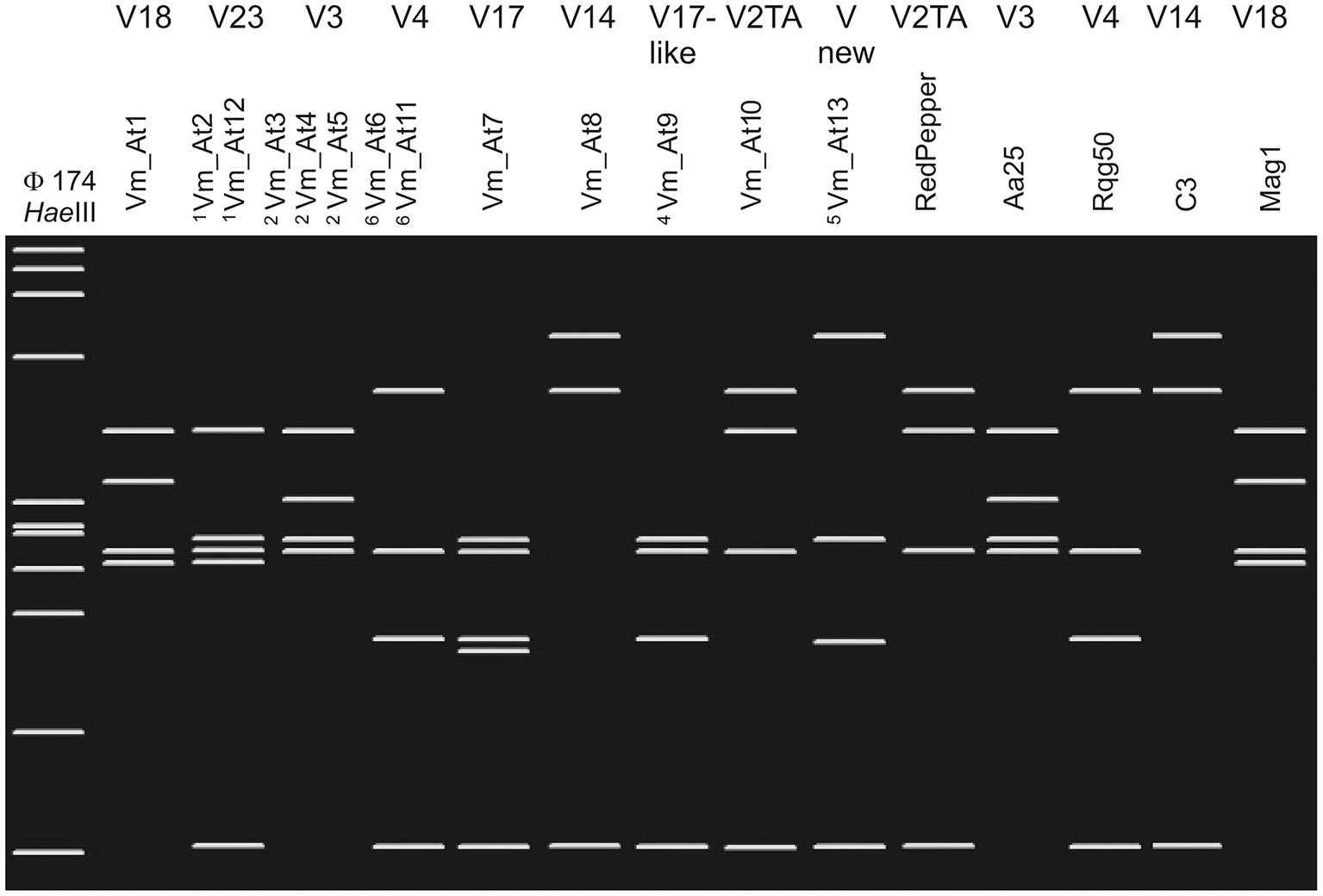 Restriction fragment length polymorphism (RFLP) profiles were obtained after virtual RsaI digestion of trimmed TYPH10F/TYPH10R PCR fragments of vmp1 of strains collected in vineyard environments in Austria and Slovenia (genotypes Vm_At1–Vm_At13) and the reference strains RedPepper, Aa25, Rqg50, C3, and Mag1. The patterns were generated by pDRAW32 1.1.147. The RsaI-RFLP profiles are labeled on top with the V nomenclature as suggested by the SEE-ERA.NET nomenclature (Foissac et al., 2013). 1Genotypes Vm_At2 and Vm_At12 show identical RsaI-RFLP profiles. 2Genotypes Vm_At3, Vm_At4, and Vm_At5 show identical RsaI-RFLP profiles. 3Genotypes Vm_At6 and Vm_At11 show identical RsaI-RFLP profiles. 4The RsaI-profile of Vm_At9 has not been labeled in the V nomenclature, but the pattern is similar to the related V17 profile. 5Virtual RsaI digestion results in a novel profile. As marker HaeIII digested φX174 is shown on the left. The Fragment length from top to bottom are 1,353, 1,078, 872, 603, 310, 281, 271, 234, 194, 118, and 72 bp.