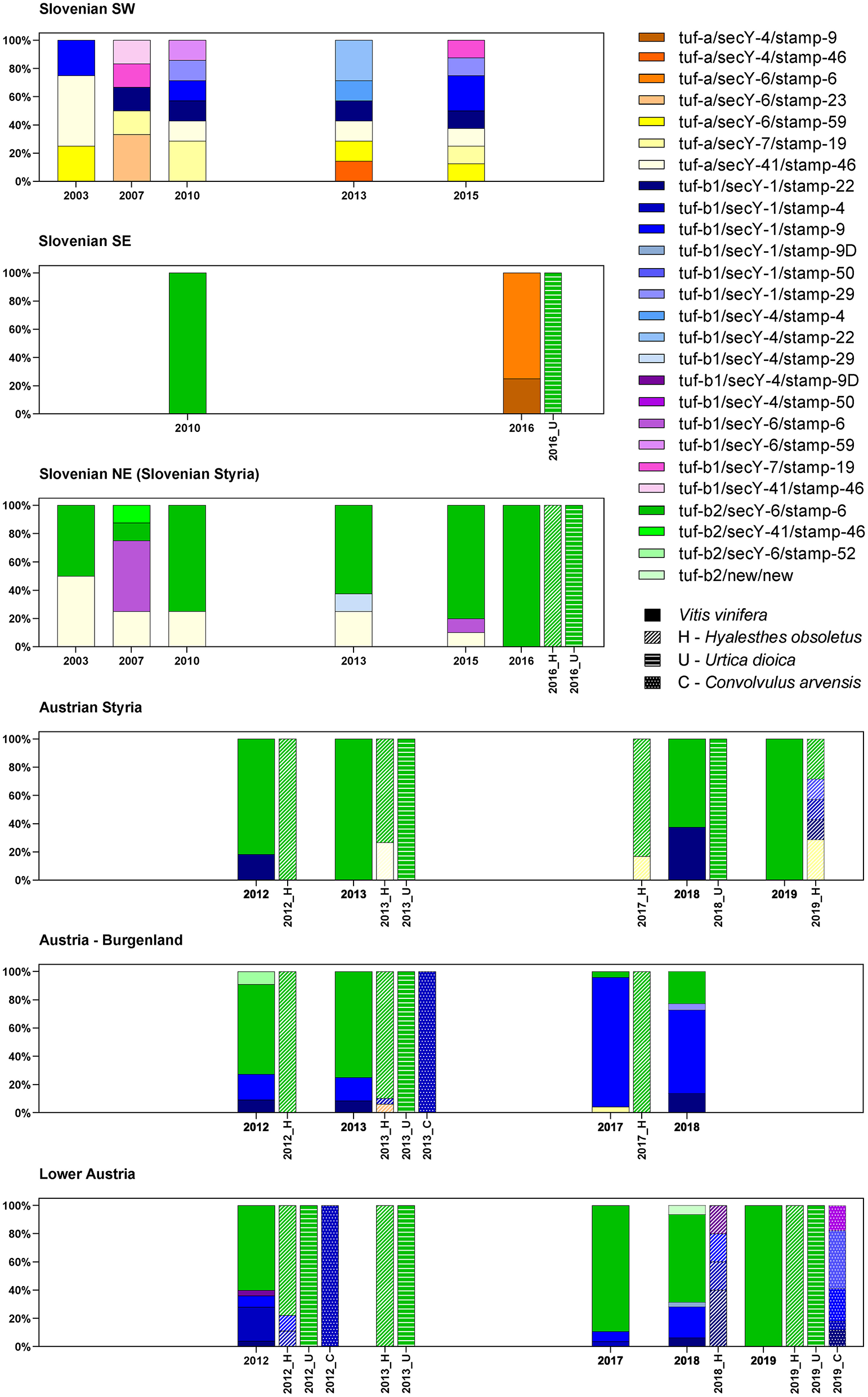 In Slovenia, the tuf-b2/secY-6/stamp-6 haplotype was detected across all the years studied here, and it was predominant in 2010, 2013, and 2015, while also being the only haplotype detected for grapevines, as well as for H. obsoletus and U. dioica in 2016 (Figure 2, Supplementary Tables 1–3).