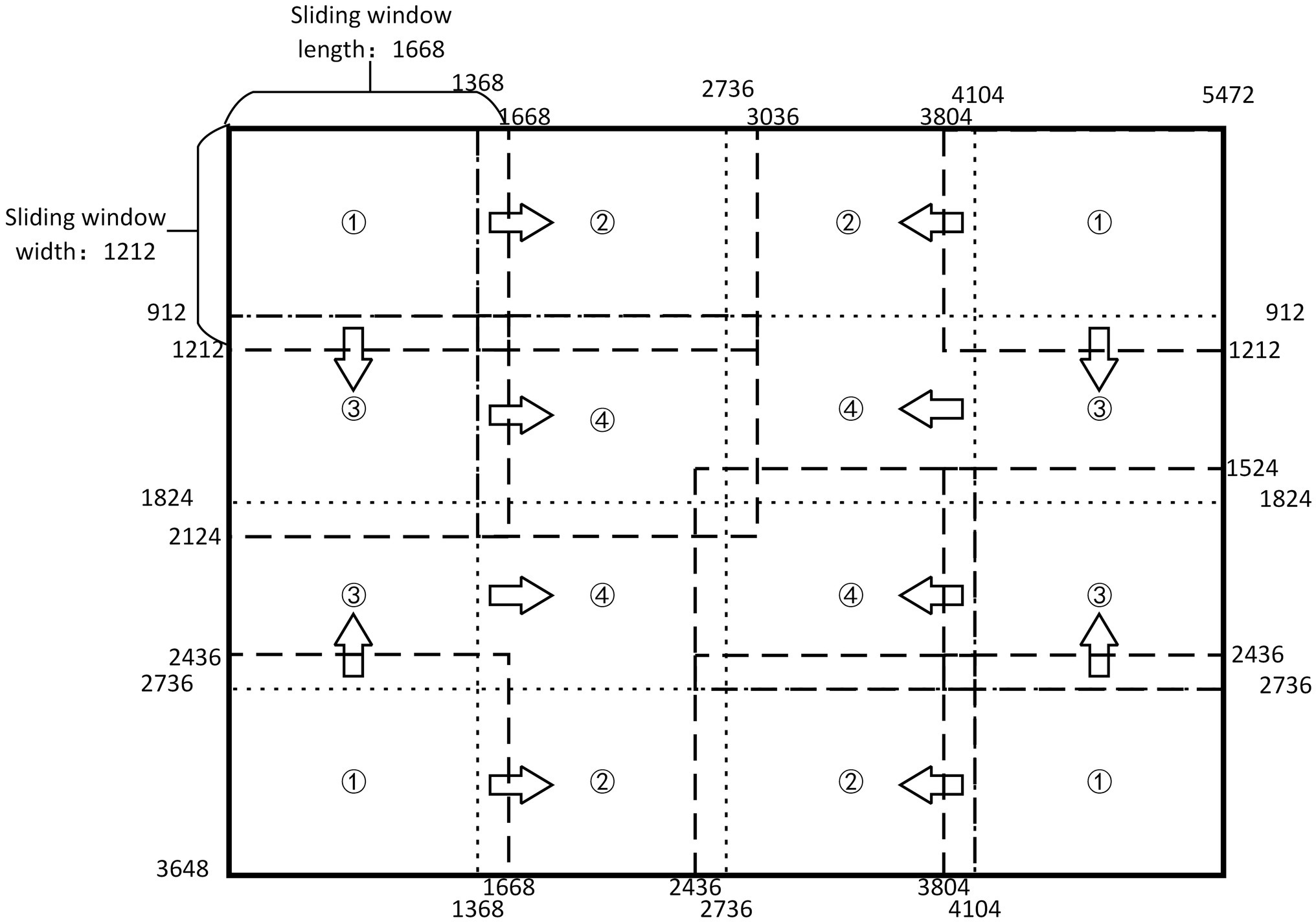 The original image is 5,472 × 3,648 pixels. We quarter the size of the original image and then add the length of the circumscribed rectangle of the largest pest (300 pixels) in the image to determine the size of the fixed window as 1,668 × 1,212 pixels. During detection, the sliding window slides towards the center from all sides. The order of movement is to move from the position (1) slides to (2) and (3) respectively, then slides from (3) to position (4). Figure 3 shows the implementation of overlapping sliding window processing method. It cuts out the image in the window to become a new subimage when sliding. The size of the new subimage is smaller than the original image, but the size of the pests in the subimage has not changed, so the area ratio of each target pest has increased. The change from small target into “large” target contributes to extract the features of the target more efficiently. In the example figure, the sliding window takes the image at position (1) and then the picture at position (2). An overlapping area of pest length is left between the two subimages, which ensures that each pest will be fully learned and detected at least once. In this way, the missing detection is reduced and the number of data sets can be increased without destroying the integrality of the insect body, which is beneficial for improving the detection precision of the model. If a target pest happens to appear on the boundary of the sliding window, part of the pest body appears in the sliding window and it may be detected by the detection box. This problem is subsequently solved by the target detection box suppression method.
