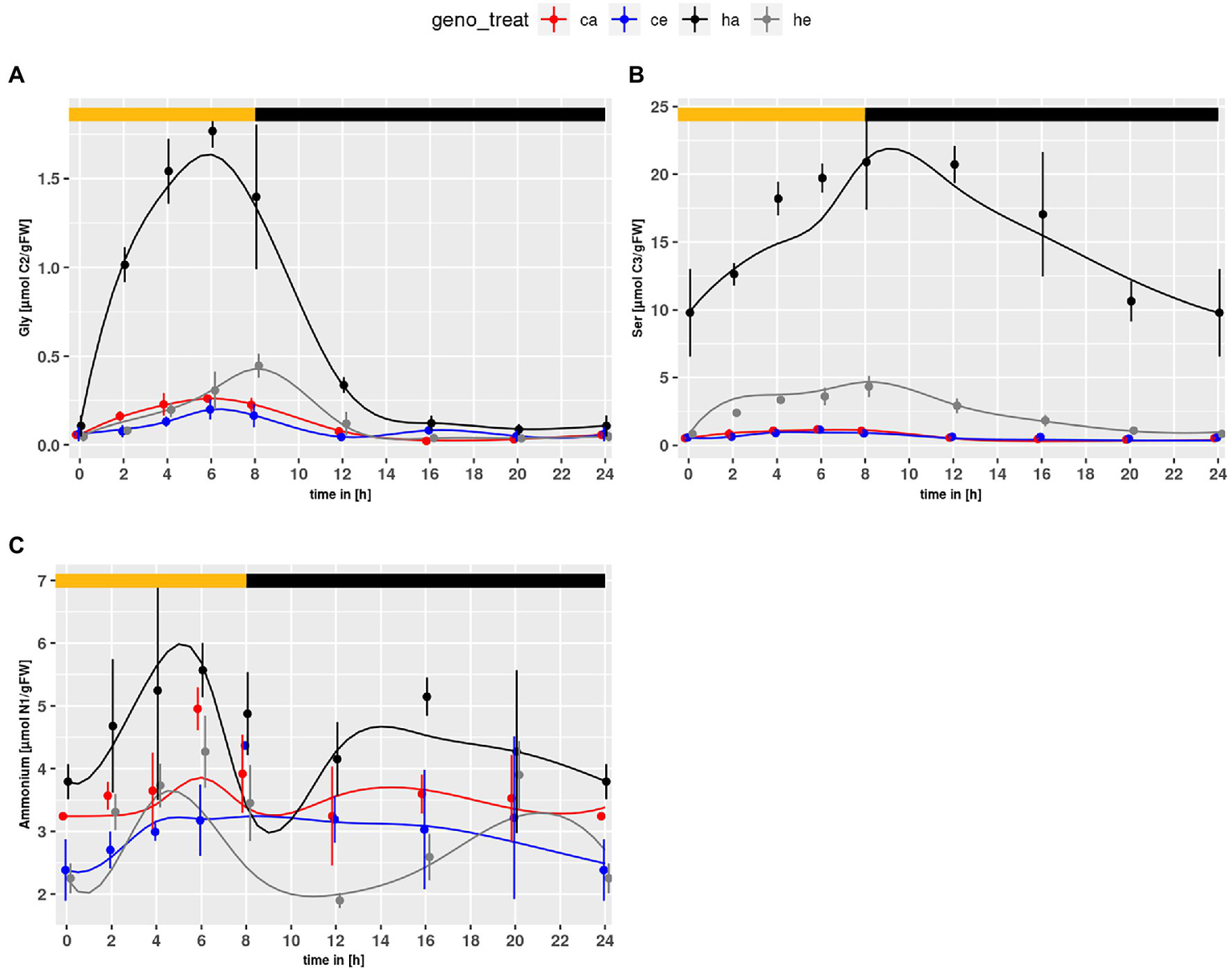 Diurnal course of photorespiratory intermediates; (A) glycine, (B) serine, (C) ammonium. Col-0 ambient: red, Col-0 eCO2: blue; hpr1-1 mutant ambient: black, hpr1-1 mutant eCO2: grey. Shown are means with standard error (n = 5). Lines represent the mean of 20 simulations. Light phase is indicated by yellow bar and dark phase indicated by black bar.