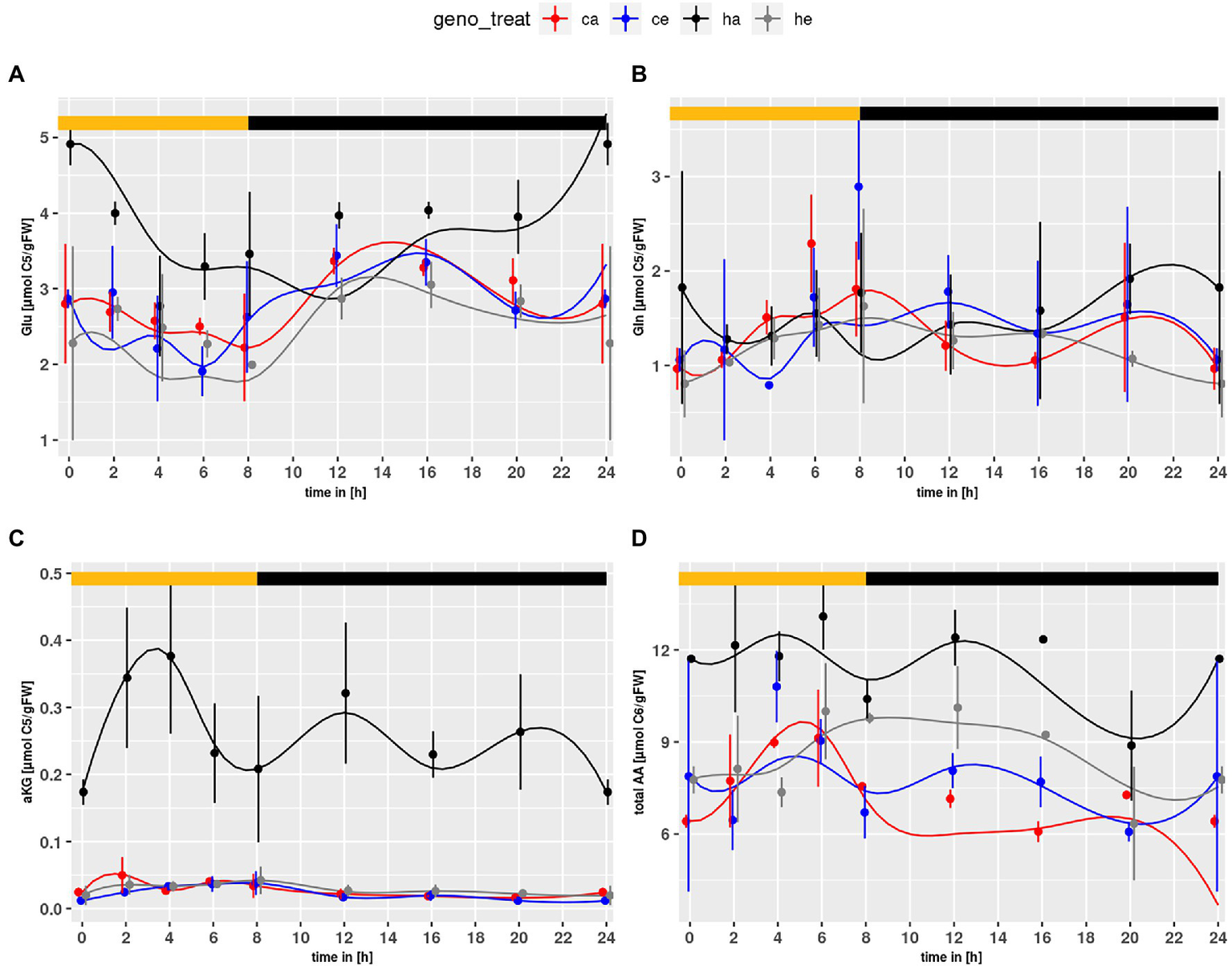 Diurnal course of (A) glutamate, (B) glutamine, (C) α-ketoglutarate, (D) total amino acids. Col-0 ambient: red, Col-0 eCO2: blue; hpr1-1 mutant ambient: black, hpr1-1 mutant eCO2: grey. Shown are means with standard error (n = 5). Lines represent the mean of 20 simulations. Light phase is indicated by yellow bar and dark phase indicated by black bar.